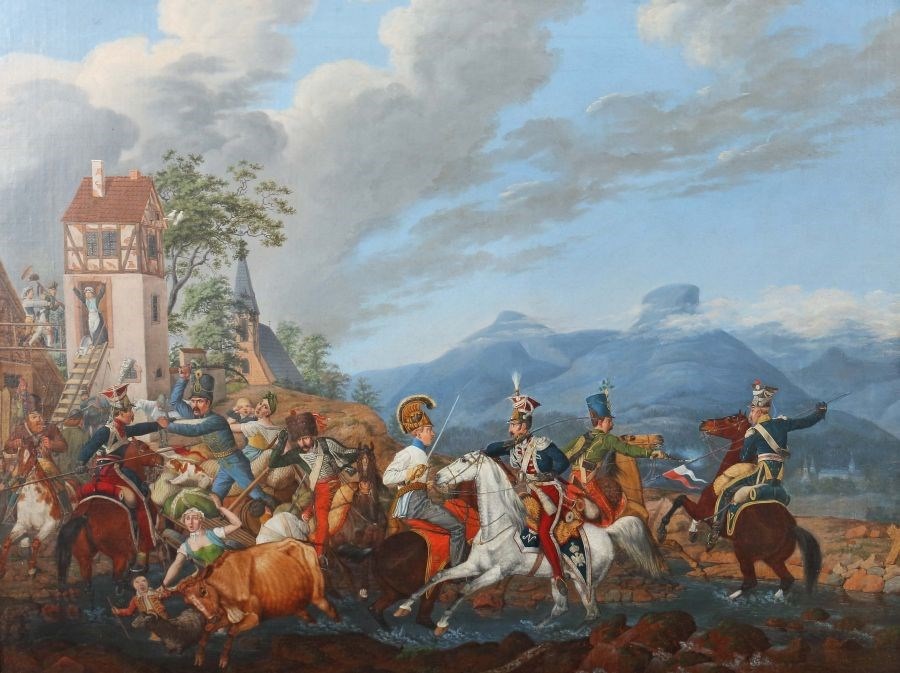Lot 1700. Steinle, Edward von (attr.) Wien 1810 – 1887 Frankfurt am Main. “Reitergefecht zwischen Österreichern und Polen während der Napoleonischen Kriege“, im Vordergrund gegen angreifende polnische Kavallerie kämpfende österreichische Reiter sowie eine flüchtende Bäuerin mit ihrem Sohn und dem Vieh, im Hintergrund Blick auf das Kirchdorf und Alpenlandschaft, unten links auf einem Stein monogr. und undeutl. dat. 1834?, Öl/Leinwand auf Karton aufgezogen, HxB: 45/57 cm. Altersspuren, rest., ret., min. Farbabplatzer. Mit Rahmen. Reserve 8,000 euro. Siebers. 06/26/20