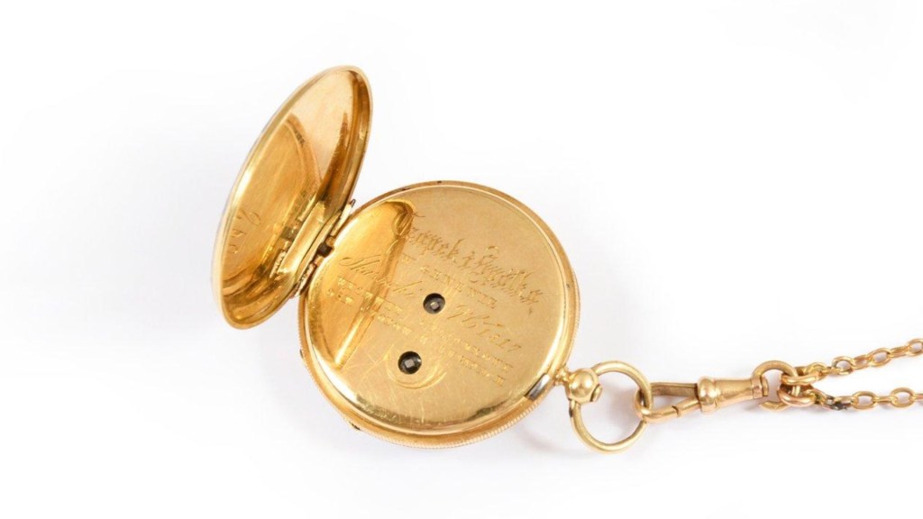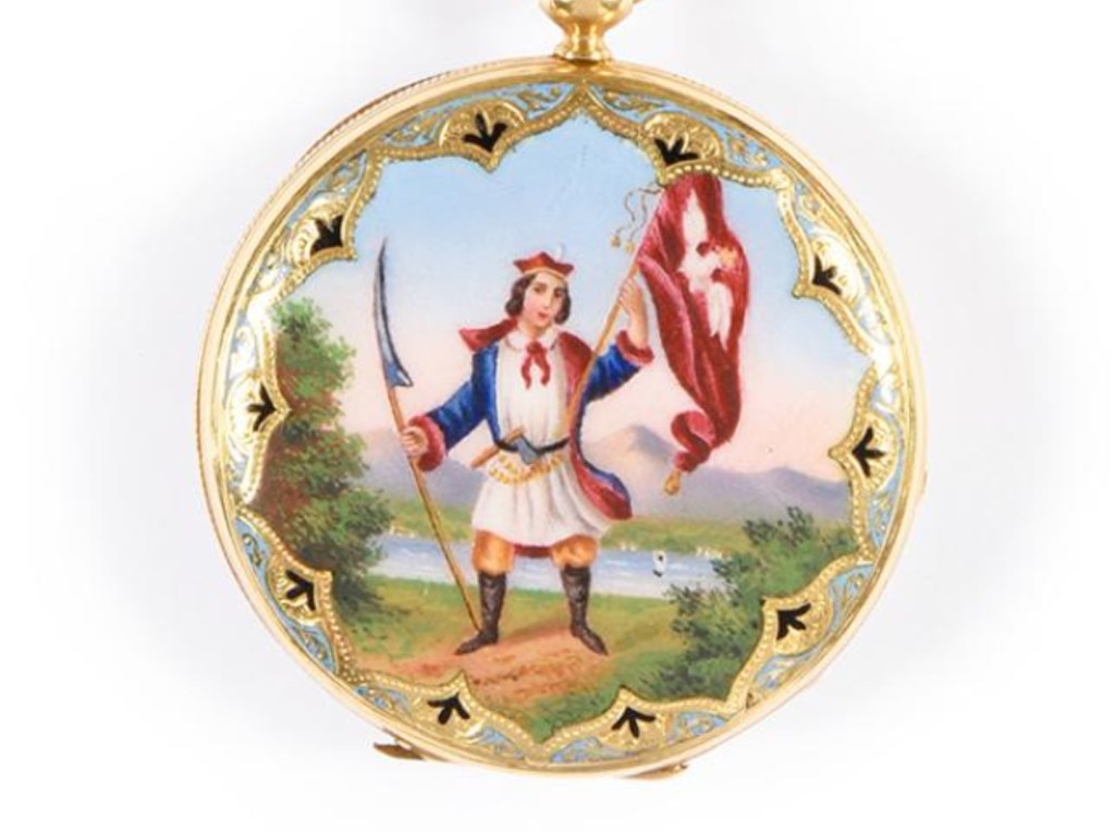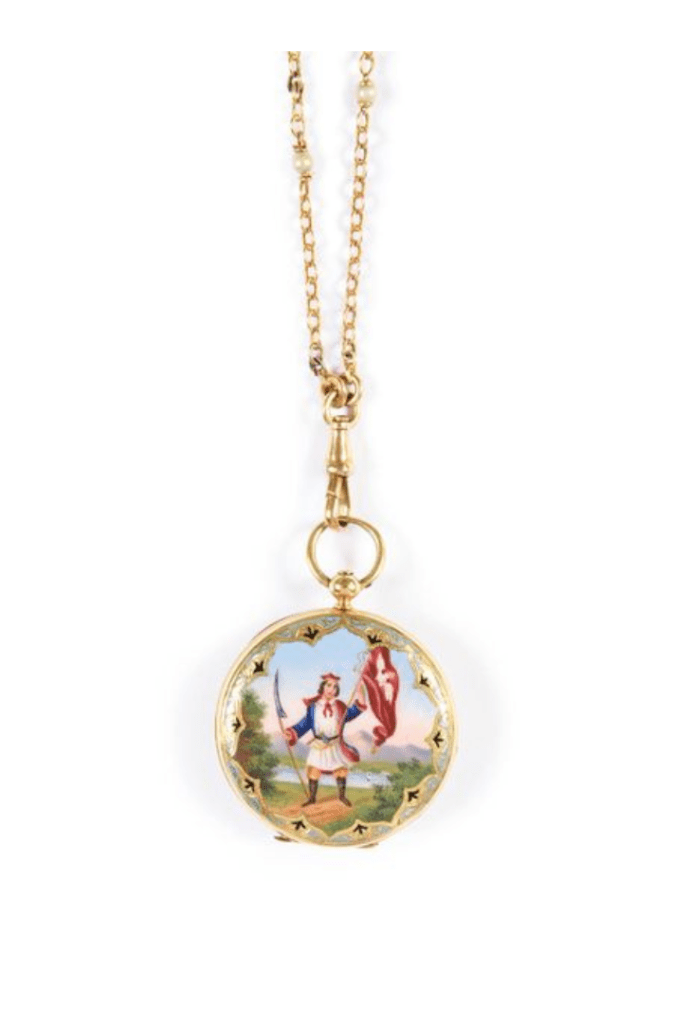 Lot 155. INDEPENDENCE FROM POLAND. Ladies’ watch, in pink gold, with its link chain and small pearls, decorated with an enamelled plaque featuring a peasant carrying a flag in the colours of independent Poland. Mechanism signed Czapek i Spolka in Geneva, Karowki dated 1817. Wear and tear, but good condition. Diameter: 3 cm. Gross weight: 21 grs. Estimate 1,200 – 1,500 euro. Coutau-Begarie. 06/11/20