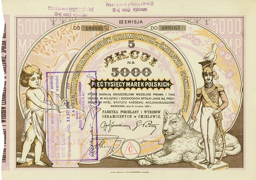 Pięknie zachowana akcja fabryki ćmielowskiej z 1922 roku.