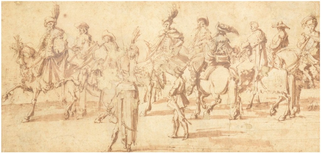 Our drawing is undoubtedly a study for The Entry of the Polish Ambassador to Rome in 1633, one of the first engravings made upon his arrival in Rome by Stefano della Bella. This is a major work in the artist’s career both in terms of importance and size. The engraving consists of six leaves accompanied by an explanatory caption and a dedication to Lorenzo de Medici.