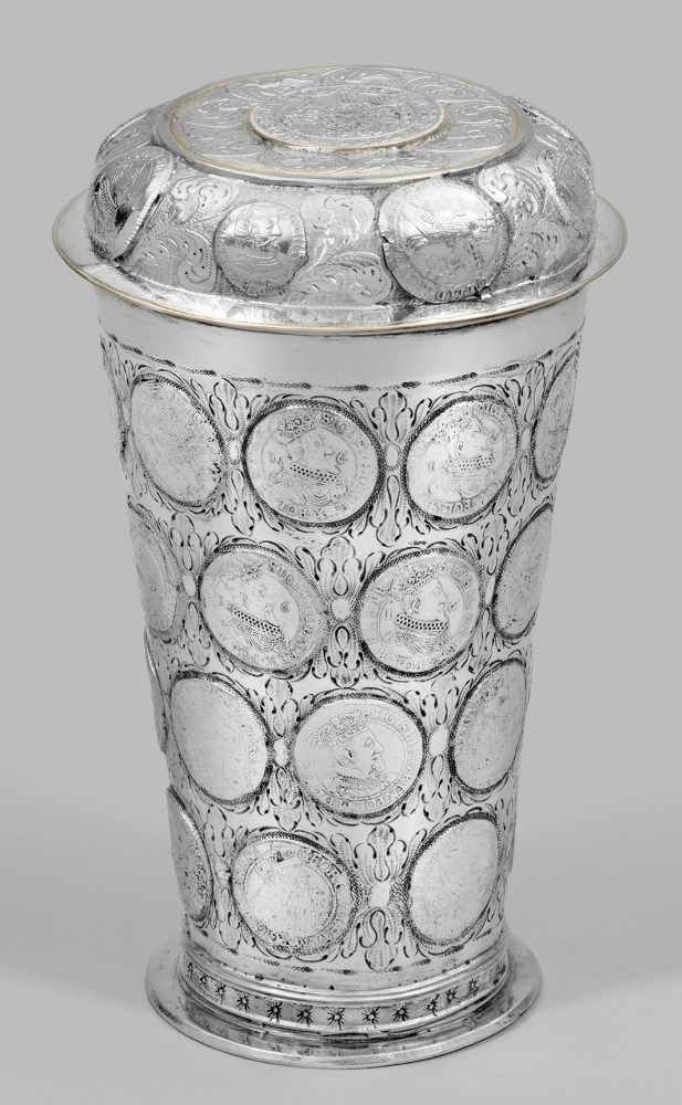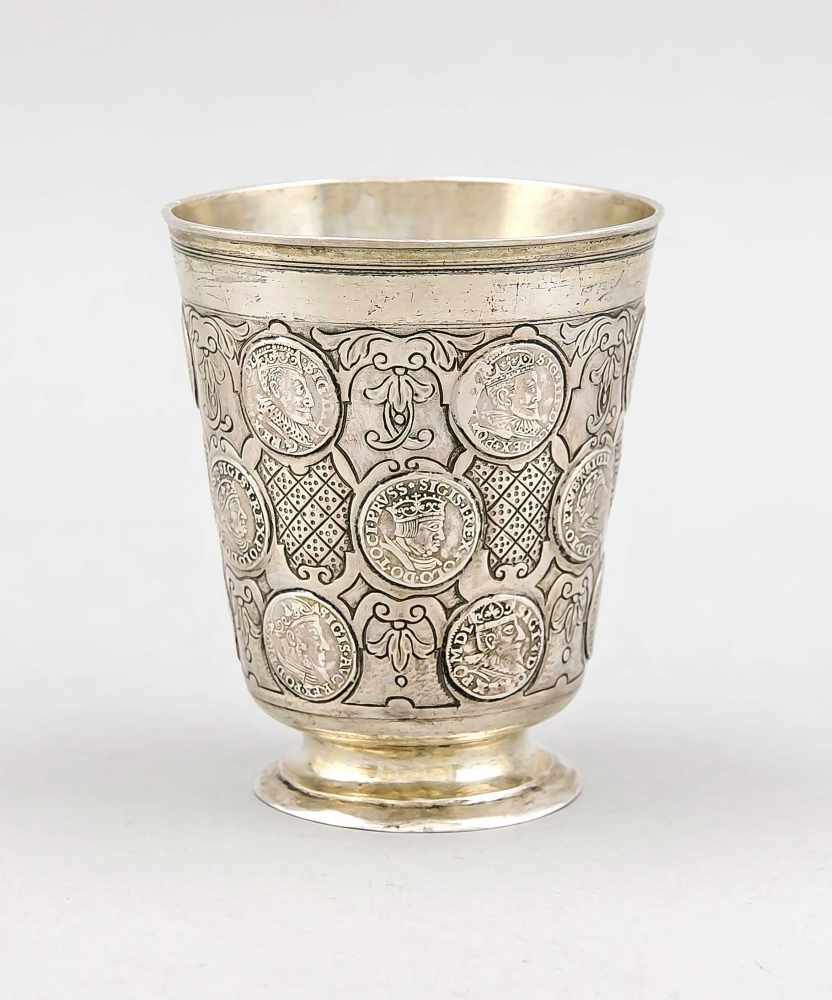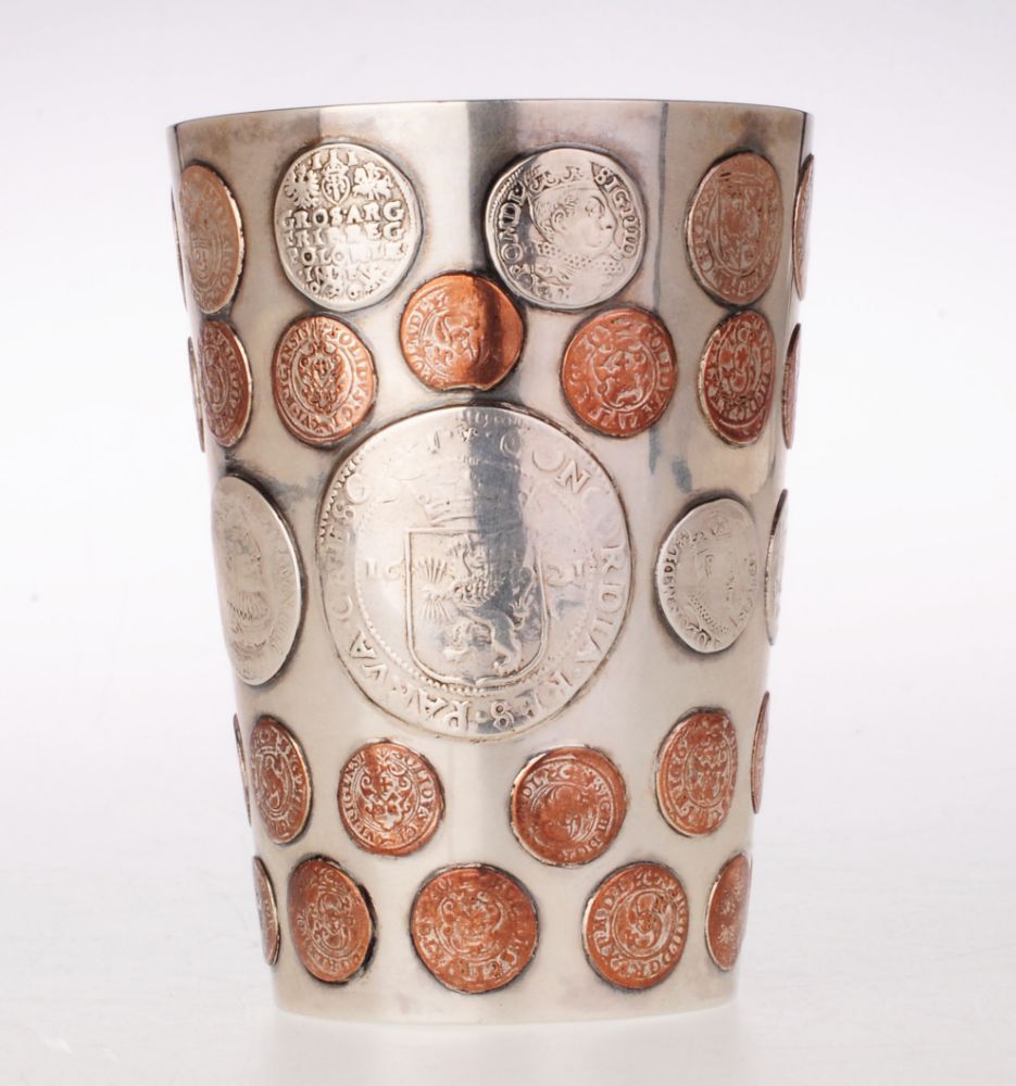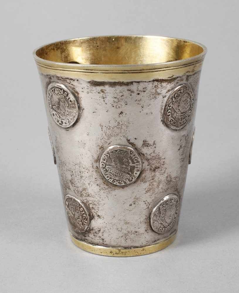 Lot 1454. Barockbecher, wohl Deutsch, frühes 18. Jh., BZ: wohl Berlin, MZ: undeutl., Silber punziert, Tremolierstrich, Teilvergoldung, auf rundem gewölbten Stand, konischer Korpus, profilierter Lippenrand, Wandung mit 18 eingelassenenen polnischen Münzen, H. 11 cm, ca. 179 g. Reserve 1,800 euro. Historia Auktionshaus. 08/21/19