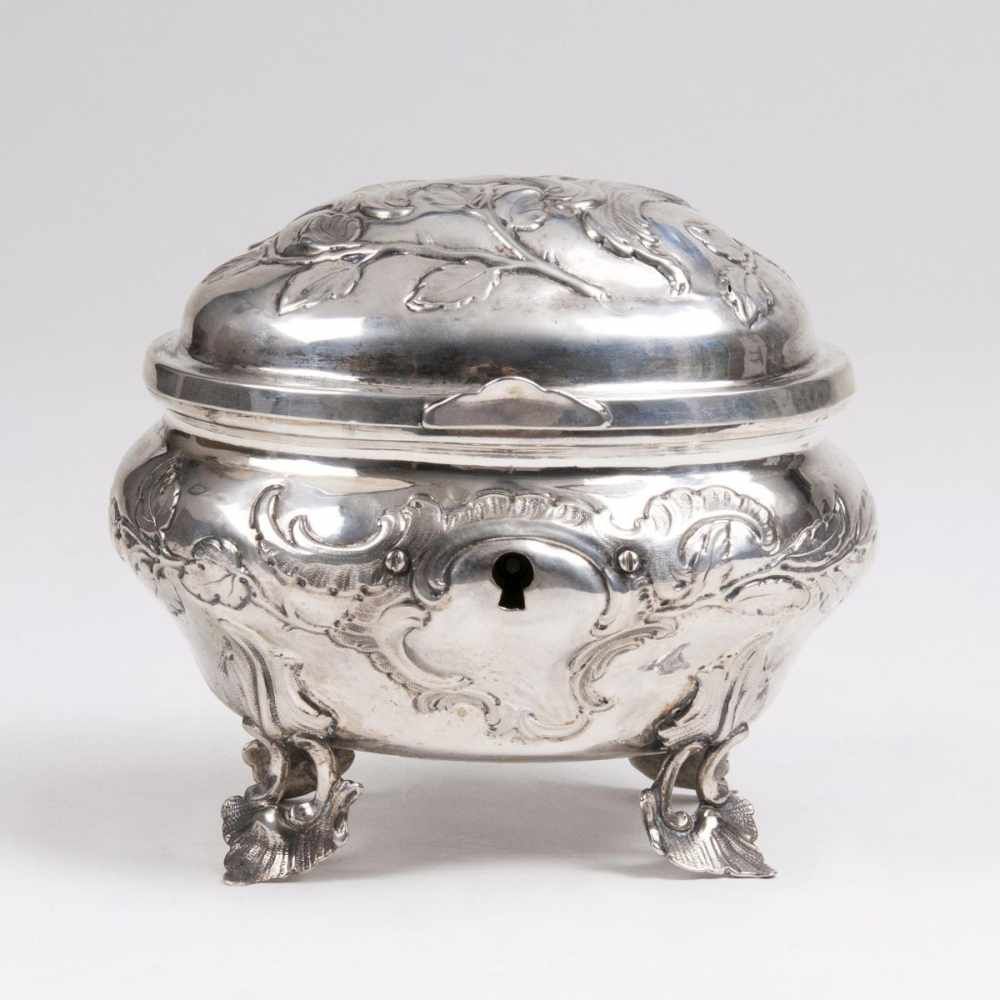 Lot 146. Kleine Danziger Zuckerdose. Silber. Von eingerollten Füßen getragener, sich bauchig erweiternder Korpus. Aufgewölbter Deckel mit geschweifter Daumenrast aus reliefierten Rocaillen, bekrönt von Knospenknauf. Wandung und Deckel gegliedert durch breite Bänder. Gest. Stadtmarke, Ältermann Christoph Türck, Meister Abraham Arentz (wird Meister 1745). Gew. ca. 190 g. H. 9,5 cm. 12 cm x 8 cm.