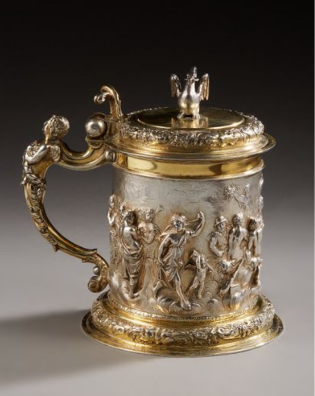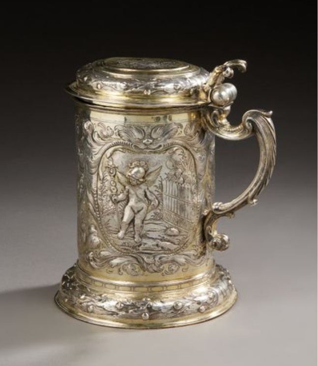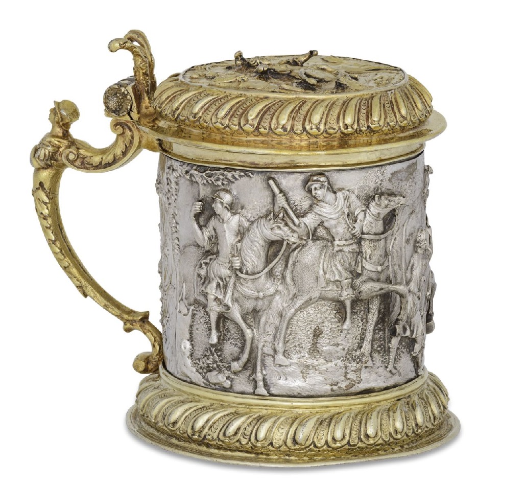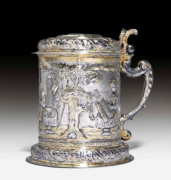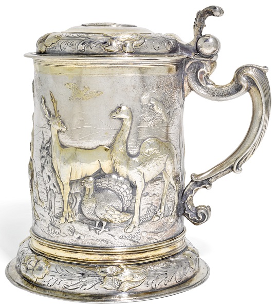 Lot 462. A POLISH PARCEL-GILT SILVER TANKARD. MARK OF HIERONYMUS HOLL II, DANZIG, 1689-1699. Cylindrical on domed foot, the body chased and engraved with lovers in landscape, with harp-shaped handle and hinged domed cover with bifurcated scroll thumbpiece, and seated deer finial, marked on foot and cover, 9 in. (23 cm.) high, 28 oz. 10 dwt. (888 gr.). Provenance: Arne Bruun Rasmussen, Copenhagen 2010, With Stahl, Hamburg, 2013. Estimate GBP 5,000 – 7,000. Christie’s. 11/14/19. Sold 6.875 GBP