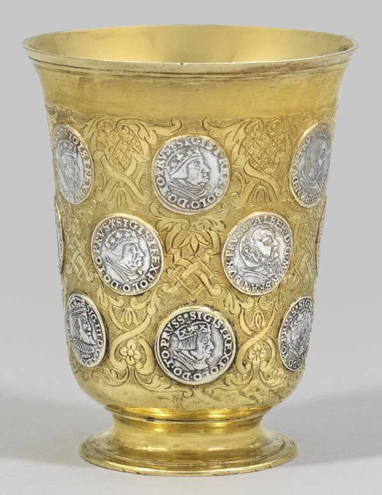 Lot 85. Berliner Münzbecher. Teilvergoldet. Hoher, glockenförmig ausschwingender Korpus mit profiliertem Lippenrand. Wandung dreireihig versetzt besetzt mit insges. 18 unterschiedlichen Münzen mit der Darstellung von König Sigismund I. von Polen, König Sigismund III. von Polen sowie Albert, Markgraf von Brandenburg, teilw. dat. 1538-1546. Münzen umzogen von meisterhaft graviertem Netzgitter, gerahmt von Blattwerk und Voluten über fein punziertem Grund. Im Boden eingelassene französische Münze, dat. 1656. Innen vergoldet. Gest., Tremolierstrich, Meister Johann Bernhard Müller und Martin Friedrich Müller (werden Meister um 1737). Gew. ca. 190 g. H. 11 cm. Berlin. Um 1750. Reserve 3,800 euro. Schloss Ahlden. 09/07/19. Not sold
