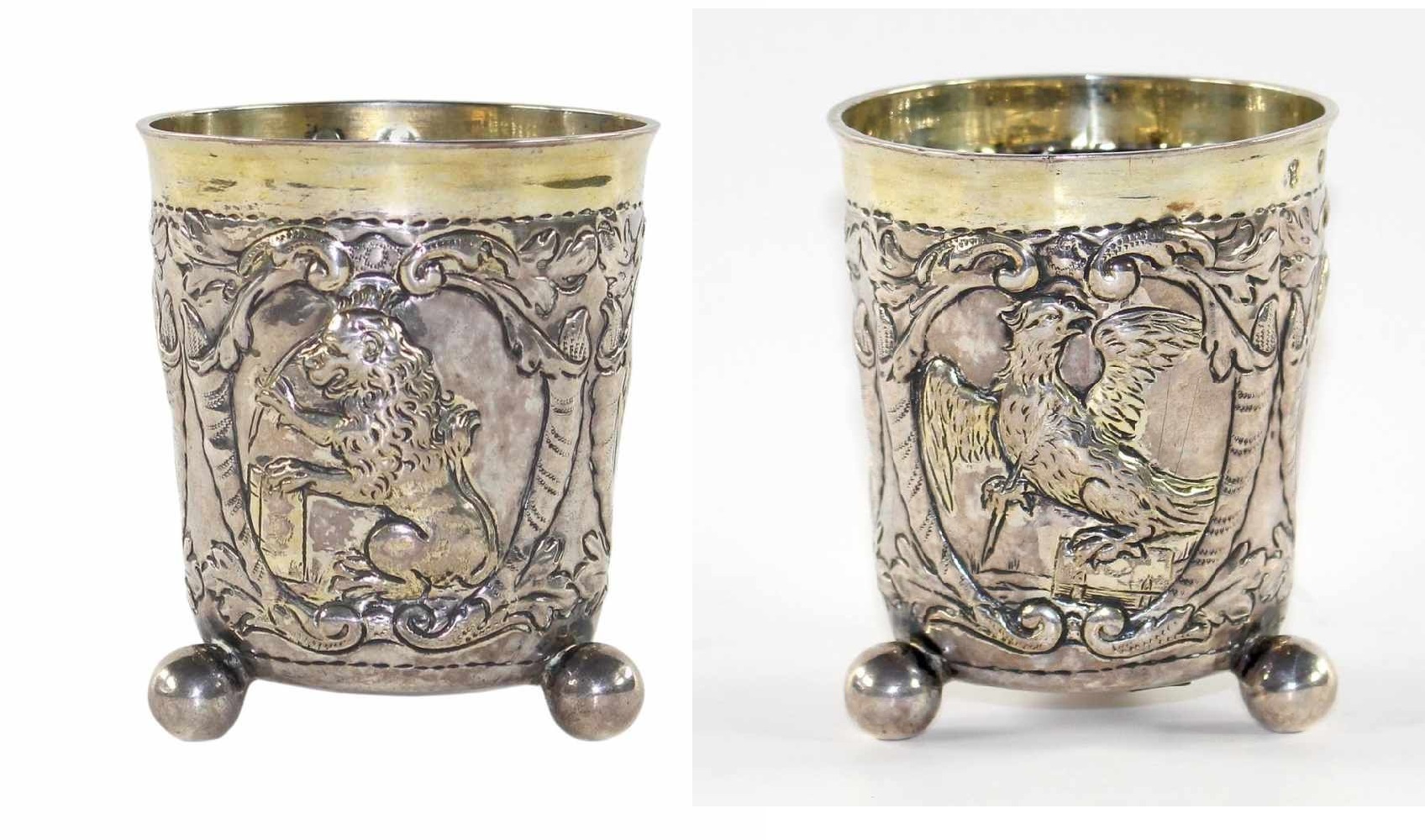 Lot 4228. Danzig Kugelfußbecher mit Evangelistensymbolen. Becher des Meisters Johann Meinertz, Danzig 1680-1709. Silber, gegossen, getrieben, punziert und partiell vergoldet. Wandung mit drei Rocaillekartuschen mit den Evangelistensymb. des Engels (Matthäus), des Adlers (Johannes) und des Löwen (Markus). Meistermarke und Beschauzeichen. Wandung mit Druckstelle. H: 9,3 cm. D: 8 cm. Gew. 107 Gr. Estimate 1,200 euro. Keiffer. 10/12/19