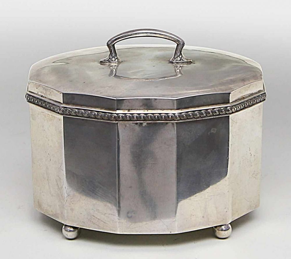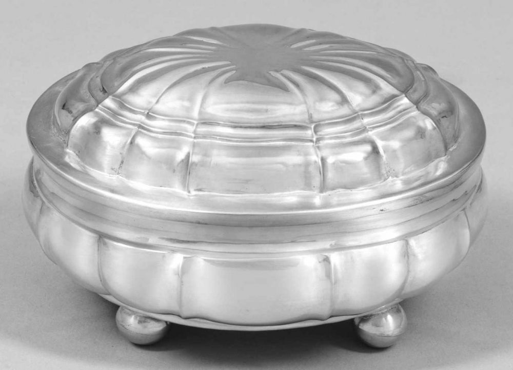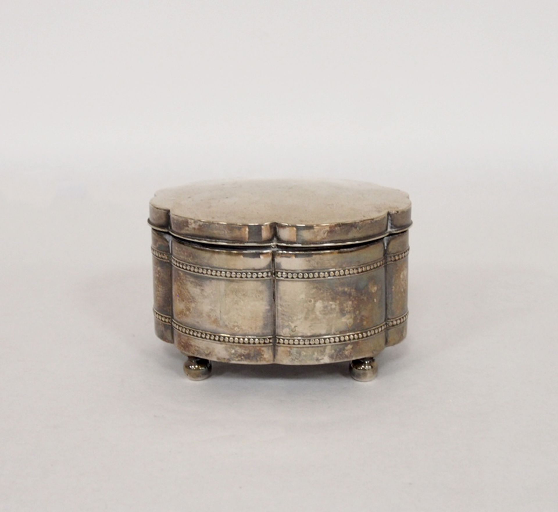 Lot 1093. Ovale Deckeldose. 800/000 Silber, ca. 328 g. Mehrpassige Wandung mit umlaufendem Reliefband. Auf vier Kugelfüßen. L. Altersspuren. Polen, 1920-1963. 11x 13x 10,5 cm. Reserve 80 euro. Auktionshaus Dannenberg. 09/13/19. Sold 240 euro