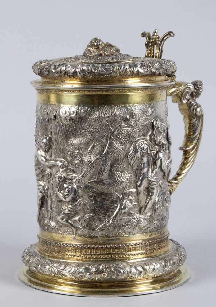 Lot 7004. Großer Elbinger Deckelhumpen. Silber, getrieben, gegossen, graviert, ziseliert und partiell vergoldet. Zylinderform. Profilierter und gewulsteter Stand. Flacher Haubendeckel mit 2-facher Wulst und Deckelbekrönung in Form eines plastischen liegenden Löwen. Henkel mit Puttenkopf und gespaltene Daumenrast. Umlaufend Reliefdekor u.a. mit der Taufe Christi. Im Boden Silbermedaille der Stadt Danzig von J. Höhn auf die Segnungen des Waffenstillstandes mit Schweden in Stuhmsdorf, 1635. Elbinger Stadtmarke, 1698-1705. Unident. Meistermarke. H. 24,5 cm. Ca. 1575 g. Opening 3,200 euro. Ursula Nusser. 09/17/19