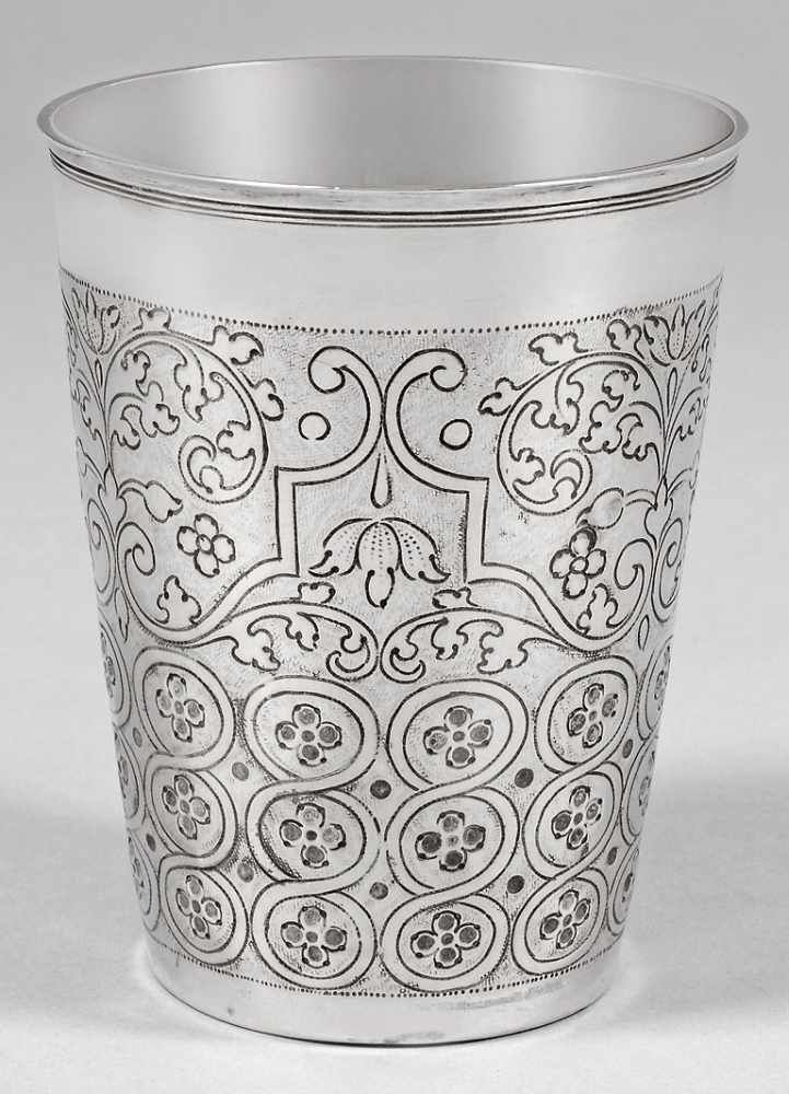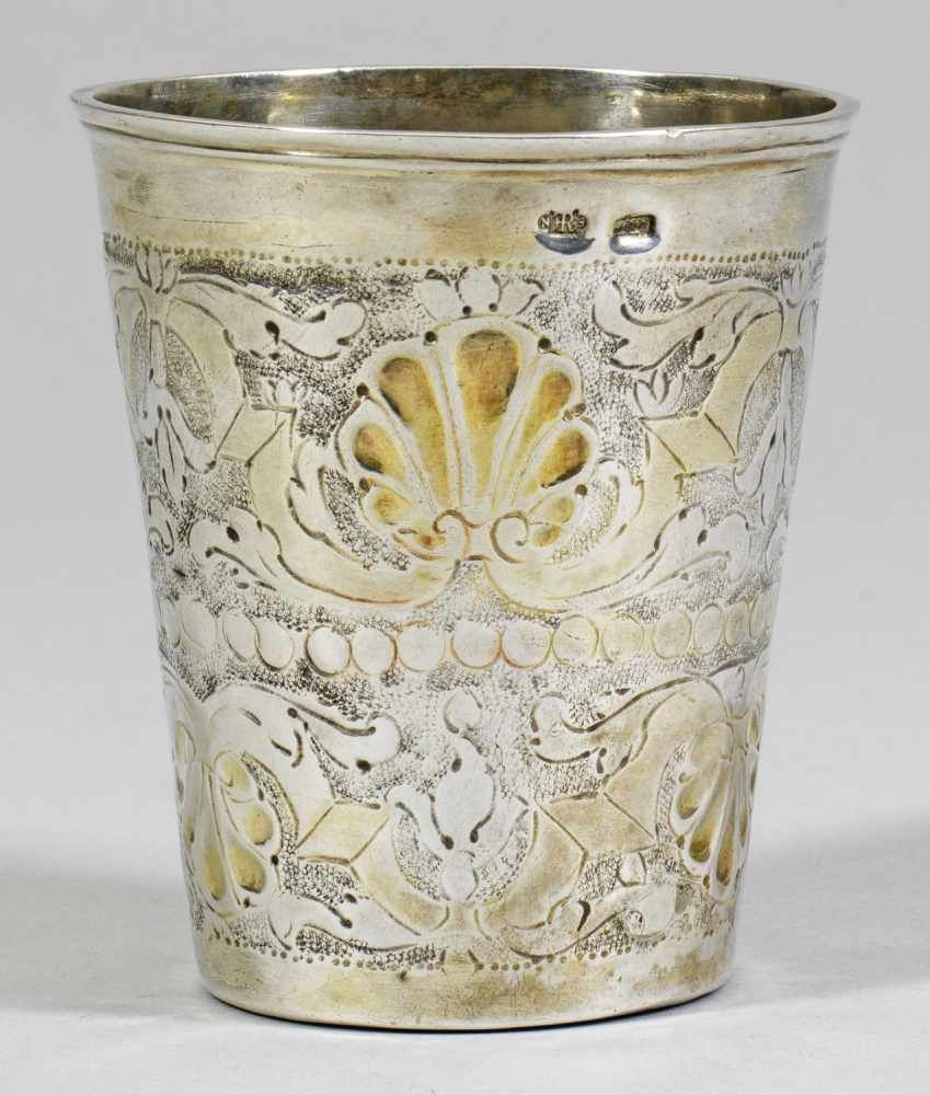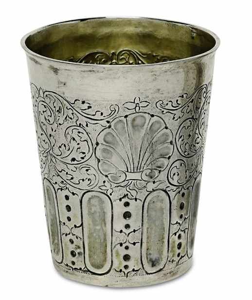 Lot 73. Becher. Danzig, um 1720, Arnholt Lange. Silber. Konisch mit profiliertem Lippenrand. Getriebener und ziselierter Dekor auf punziertem Grund: in der unteren Wandungshälfte leicht kannelierte Zungen im Wechsel mit Schleifenornamenten, darüber Muscheln im Wechsel mit Rauten und floralen Motiven. Marken (Rosenberg Nr. 1499/1588): BZ, MZ: “AL” (Meister 1699 – 1724), weiteres ungedeutetes Zeichen. H. 9,2 cm. 103 g. Estimate 900 euro. Scheublein Art & Auktionen KG. 09/20/19