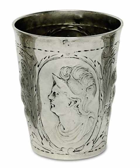 Lot 72. Becher. Danzig, um 1700, Nathaniel Schlaubitz. Silber, innen vergoldet. Konischer Becher mit flachem Stand und glattem, leicht ausgestelltem Lippenrand. Getriebener, ziselierter und punzierter Dekor: zwei Medaillons mit Porträts eines Feldherrn bzw. eines Orientalen mit Turban, dazwischen Fruchtbündel an Schleifen. Marken (Rosenberg Nr. 1499/1585): BZ, MZ: “NS” (Meister 1690 – 1726), österreichische Repunzierungen (Rosenberg Nr. 7884 u.a.). Min. besch. H. 9 cm. 107 g. Estimate 1,100 euro. Scheublein Art & Auktionen KG. 09/20/19