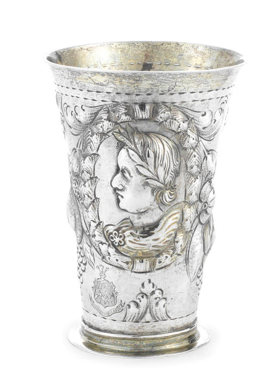 Lot 159. A 17th century Polish silver beaker by Peter Röde II, Gdansk / Danzig circa 1680. Flaring form, with gilt lip and base, the side embossed and chased with fruit and busts with laurel wreaths, height 16cm, weight 9oz. Estimate £ 800 – 1,200. Bonhams. 10/08/19