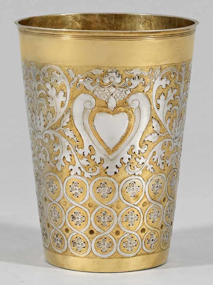 Lot 103. Großer Ohlauer Barockbecher. Teilvergoldet. Konisch mit glatten Wandungsrändern. Untere Wandungshälfte umzogen von dreireihig angeordneten Kreisornamenten, darin stilisierte Blüten. Obere Wandungshälfte fein getrieben und graviert in Form von Blattranken, im Wechsel mit reliefplastischen, bekrönten Herzen. Auf dem Boden gravierter Besitzername “Rudolph Kätzler”, dat. 1710. Gest., Tremolierstrich, Stadtmarke, Meister Gottfried Kittel (wird Meister 1697). Gew. ca. 155 g. H. 14,7 cm. Vgl. Hintze, Schlesien, S. 151, Typus V und S. 152. A parcel gilt and dated Silesian Baroque beaker by Gottfried Kittel (master since 1697). Test, city, master´s mark. Schlesien. Ohlau. 1710. Reserve 4,200 euro. Kunstauktionshaus Schloss Ahlden. 09/07/19