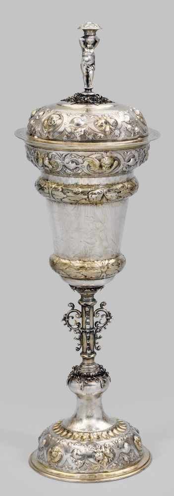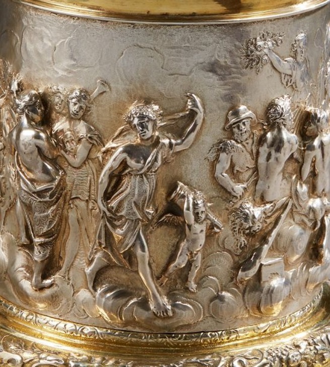Lot 111. Großer Danziger Deckelpokal von musealer Qualität. Teilvergoldet. Über glockenförmig hochgezogenem Stand kurzer, zylindrischer Schaft, flankiert von vier großen Voluten. Sich konisch erweiternde Kuppa mit trichterförmig geweitetem Rand, unterteilt durch zwei breite Wulste mit reliefplastisch getriebenen Lorbeerblättern. Auf dem Stand, dem Rand und dem gewölbten Deckel von Bandelwerk gerahmte, hochreliefplastische Darstellungen geflügelter Puttiköpfe, im Wechsel mit naturalistischen Fruchtbündeln über fein punziertem Grund. Kuppa umzogen von meisterhaft punktuell gravierter szenischer Darstellung der Delila in einem Zeltlager, dem schlafenden Samson die Haare schneidend. Seitlich dargestellter Philister mit Speeren vor den Toren einer Stadt. Vollplastischer Knauf in Gestalt eines Knaben, auf dem Kopf einen Fruchtkorb. Innendeckel vergoldet. Gest., Stadtmarke, Meister Peter Rohde III (wird Meister 1688). Gew. ca. 1860 g. H. 55 cm.
