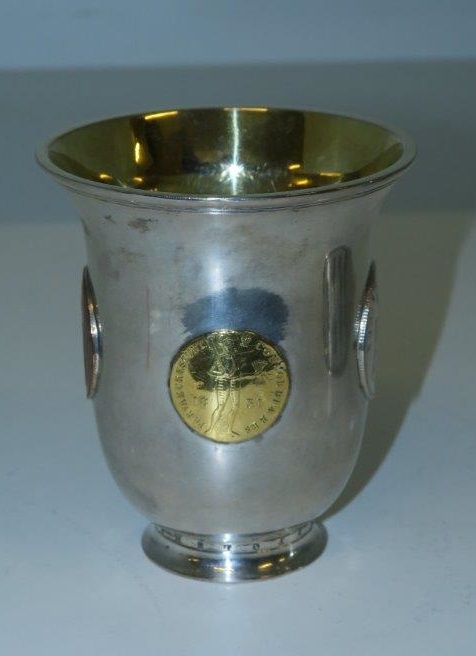 Lot 1099. A pair of parcel gilt Gdansk silver coin-set beakers. Tapering beakers with moulded rims, embossed with flowers and inset with eight French coins dating from the 17th and 18th century. H 8.7 cm, weight of each 122 g. Marks of Christian Warmbier, 1758. Estimate 5,000 – 5,500 euro. Lempertz. 11/13/20