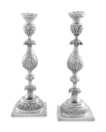 Lot 1100. A pair of Gdansk silver candlesticks. Each with a square base supporting a moulded baluster shaft. H 16.8 cm, weight 568 g. Marks of Christian von Hausen, c. 1760. Estimate 6,000 – 8,000 euro. Lempertz. 11/13/20