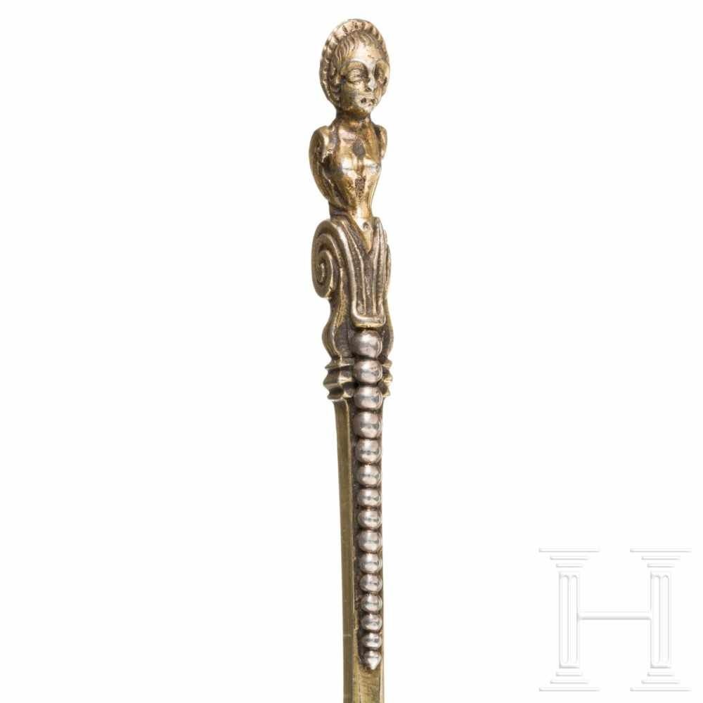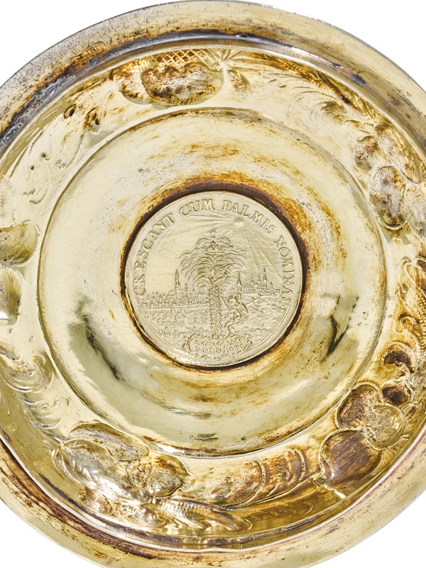 Lot 122. Seltener polnischer Münz-Deckelbecher von musealer Qualität. Teilvergoldet. Über flachem Stand sich trichterförmig erweiternder Korpus. Wandung vierreihig besetzt mit insges. 30 Talern mit den Porträts von König Sigismund III. von Polen und Georg Wilhelm Kurfürst von Brandenburg. In den Zwischenräumen fein gravierte, stilisierte Akanthusblätter. Im Boden eingelassener Habsburger Taler von 1621, avers mit dem Porträt von Erzherzog Leopold V. als Gubernator, revers gekröntes Wappen. Auf dem Deckel zentral eingelassener Taler von 1634, avers Porträt von Bogislaw XIV. Herzog von Pommern. Revers pommersche Wappen auf einem Wappenschild, getragen von zwei Wilden Männern. Umlaufend breite Akanthusblattranke. Unterhalb acht einreihig eingelassene, unterschiedliche Dreigröscher mit den Porträts von König Sigismund III. von Polen und Albrecht Kardinal von Brandenburg. Innen vergoldet. Gest., Stadtmarke, Meister Nikolaus Bröllmann (tätig 1670-1702). Gew. ca. 680 g. H. 20,5 cm. Der Tätigkeitszeitraum von Nikolaus Bröllmann fiel in eine friedliche Periode unter der Regentschaft von Johann III. Sobieski, in der in Thorn der Handel und das Kunsthandwerk aufblühen konnten. Zu den Auftraggebern Bröllmanns gehörte hauptsächlich der polnische Adel; Aufgrund der herausragenden Qualität seiner Werkstücke war Bröllmann einer der führenden Goldschmiede, der die Arbeiten seiner Zeitgenossen spürbar prägte. Gradowski, 1994, S. 147, Nr. 6. J. Tylicke, Brollmanns – The goldsmiths of Torun on the turn of the 17th century, 1992, S. 127 f.; J. Tylicke, Bröllmannowie zlotnicy torunscy prezelomu XVII i XVIII w, 1994, S. 63, hierzu S. 97. A chased and parcel gilt Polish lidded beaker of high quality set with coins by Nikolaus Bröllmann (active 1670-1702). City and maker´s mark.Thorn. Um 1680. Reserve 13,500 euro. Schloss Ahlden. 09/07/19. Not sold