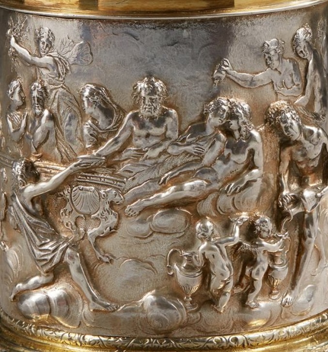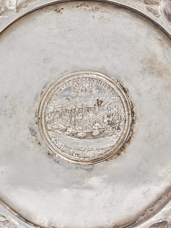 Trzeba powoli przyzwyczajać się do coraz wyższych cen sreber gdańskich. Jeszcze niedawno tyle (ca 5,000 euro) płacono za ozdobne kufle z przykrywami (tankard) znanych złotników. W przypadku tego niezwykle ozdobnego kubka jubiler gdański, bijący puncę ‘BC’, jest niezospoznawalny z nazwiska.