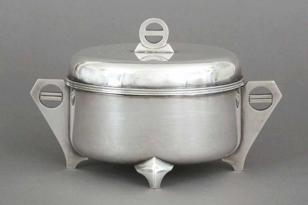Lot 1526. Zuckerdose Art Deco. Metall, versilbert, Hersteller (gemarkt) ¨Fraget¨, ovale Dose mit Scharnierdeckel, 2 seitliche Handhaben mit kreisförmigem Durchbruch, Deckelknauf mit korrespondierendem Dekor, im Inneren vergoldet, L 18cm, H c.a 12cm. Reserve 65 euro. Auktionshaus Rotherbaum oHG. 10/19/19
