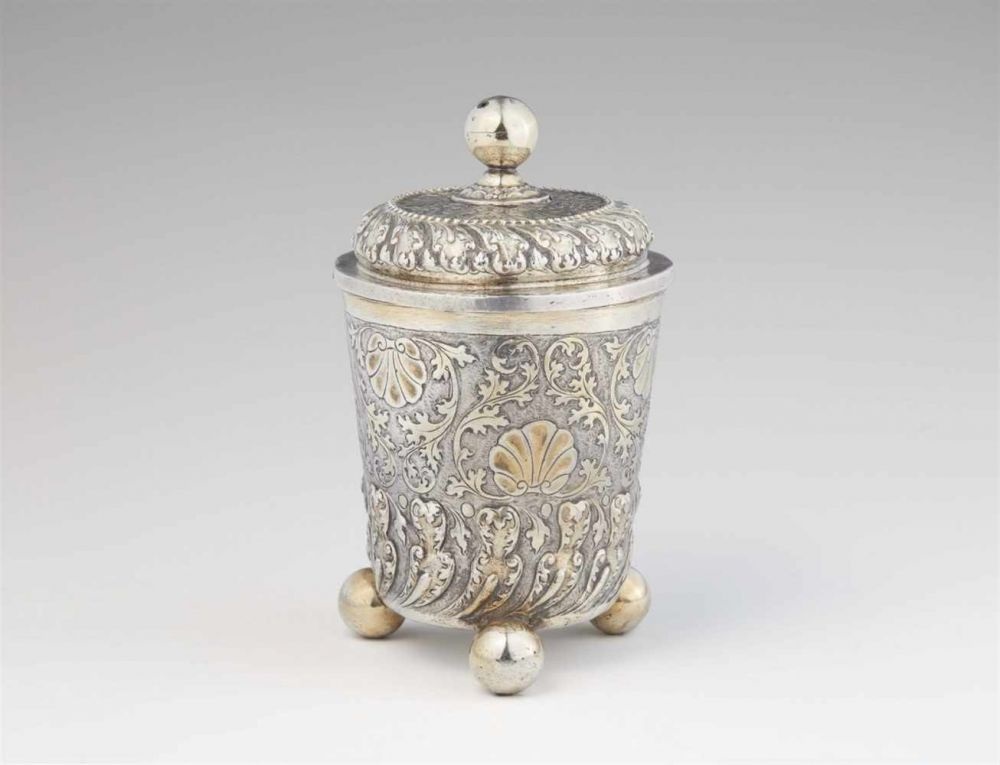 Lot 425. An Ohlau parcel gilt silver beaker and cover. Tapering cylindrical beaker with slip lid resting on three spherical feet. H 18.5 cm, weight 291 g. Marks of Siegmund Wolfgang Preuss, ca. 1710 – 20. Estimate 3,200 – 3,500 euro. Lempertz. 11/15/19