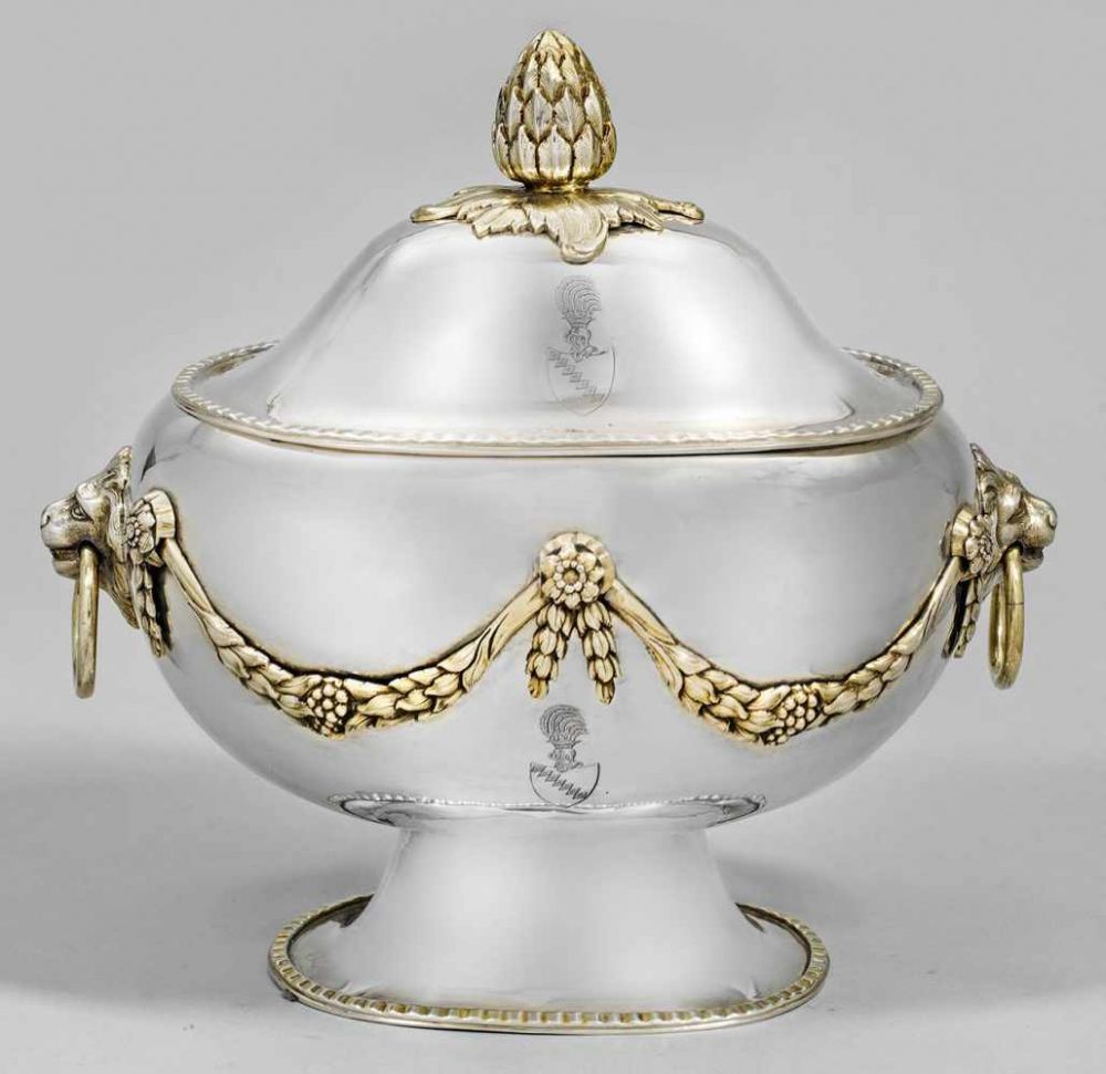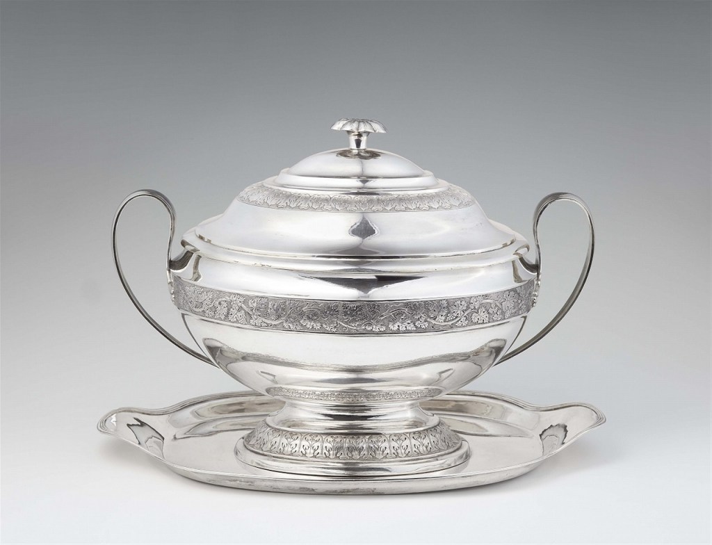 Lot 431. A Danzig silver tureen on stand. Large interior gilt oval tureen decorated with palmettes and grapevines in relief. W 46; D 29; H 30 cm, total weight 3,799 g. Maker’s mark attributed to Johann Jacob Raths, ca. 1828. Estimate 8,000 – 9,000 euro. Lempertz. 11/15/19