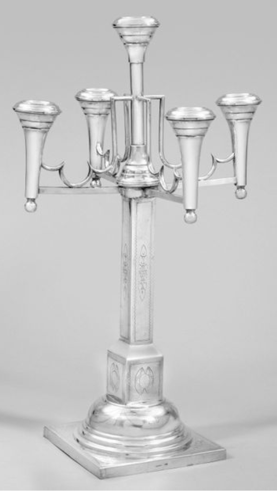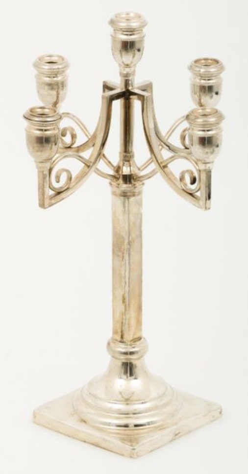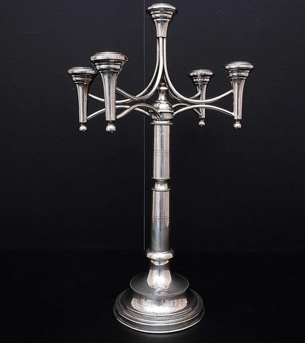 Kandelabr pięcioświecowy wyprodukowany, wg, opisu, w Warszawie choć jeśli nie zobaczę punc to nie uwierzę. Takie kandelabry były domeną jubilerów z Krakowa. Kandelabr jest rozkręcany i góra, tj. pięć świeczków, była przykręcana do różnych wysokich podstaw. Dlatego można znaleźć różne kombinacje dużych kandelabrów. W zależności od zamontowanej podstawy można spodziewać się zapłacić do 2,000 euro.