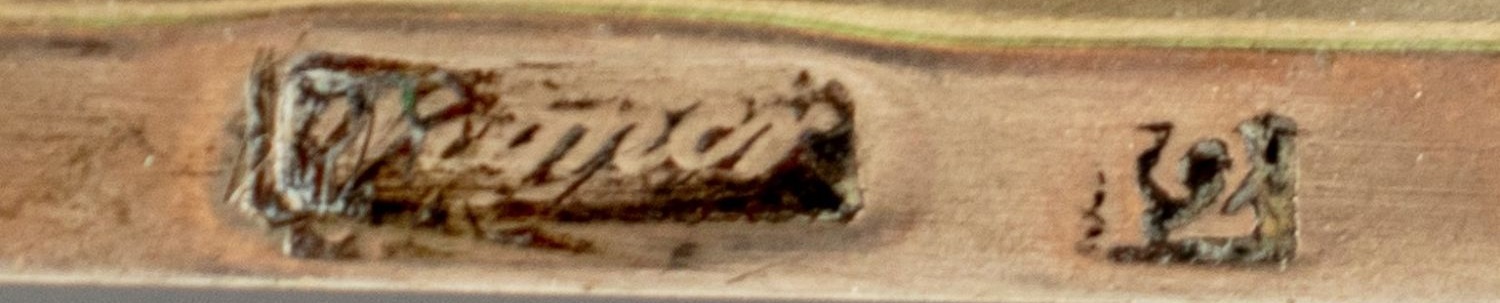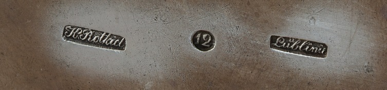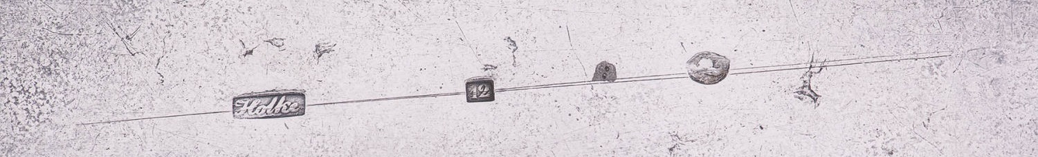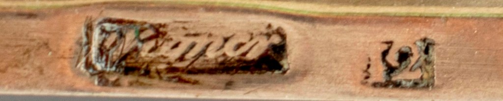 Polska cukiernica międzywojenna, której autorstwa niemiecki Dannenberg nie był w stanie rozszyfrować. Autorem był Wladysław Hempel (1871 – 1944), który był ponoć najzdolniejszym uczniem innego znanego złotnika, Antoniego Riedla. Wybita punca (halmark) Hempla to litery WH znajdujące się w wydłużonym sześciokącie. Sama cukiernica może nie jest aż takim arcydziełem, jest dość pospolita, wpisana wg. mnie trochę topornie w okres art-deco. To co mi się w niej podoba to prosty kanciasty kształt, natomiast ‘szlaczek’ w góry oraz uchwyt do pokrywki nie mają nic wspólnego z art-deco, są to pozostałości inwentaryzacyjne z innego okresu.