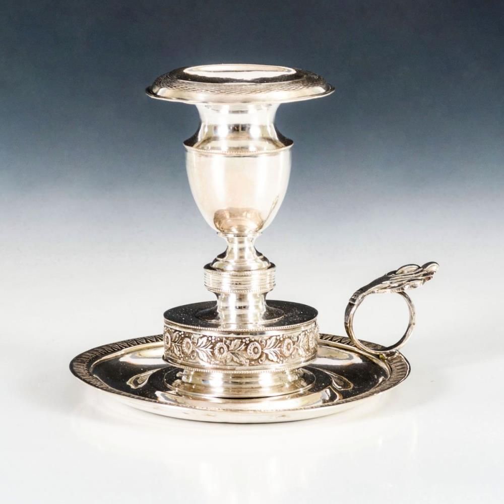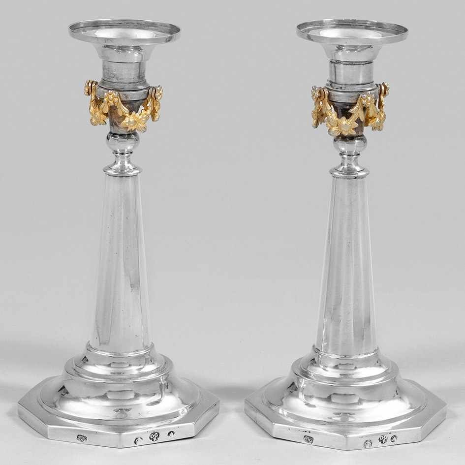 Lot 131. Paar Empire-Tafelleuchter. Silber. Über achtseitig gekantetem Fuß hoher, facettierter Schaft. Vasenförmige Tülle, umzogen von plastischen, vergoldeten Fruchtfestons. Herausnehmbare Traufschale. Gest., Stadtmarke, Jahresbuchstabe M, Meister David Gottlieb Raudner (wird Meister 1793). Gew. zus. ca. 510 g. H. 19,2 cm. A Wroclaw pair of Empire silver candlesticks by David Gottlieb Raudner (master since 1793). City mark, year letter M, master´s mark. Schlesien. Breslau. 1796-1804. Reserve 2,100 euro. Schloss Ahlden. 11/30/19. Not sold