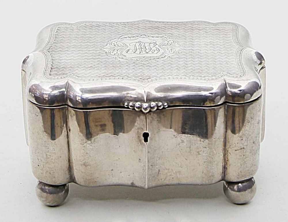 Lot 1066. Dose. 84 zolotnik Silber, 454 g, Innenvergoldung. Rechteckig mit abgerundeten Ecken, auf Kugelfüßen. Deckel mit graviertem Dekor und monog. Mz. Malez, Beschau für Warschau, Beschaumeister wohl Josef Sosnkowski (aktiv in Warschau 1860-1867) und dat. 1865. 8x 15x 11 cm. Reserve 100 euro. Dannenberg. 12/6/19.