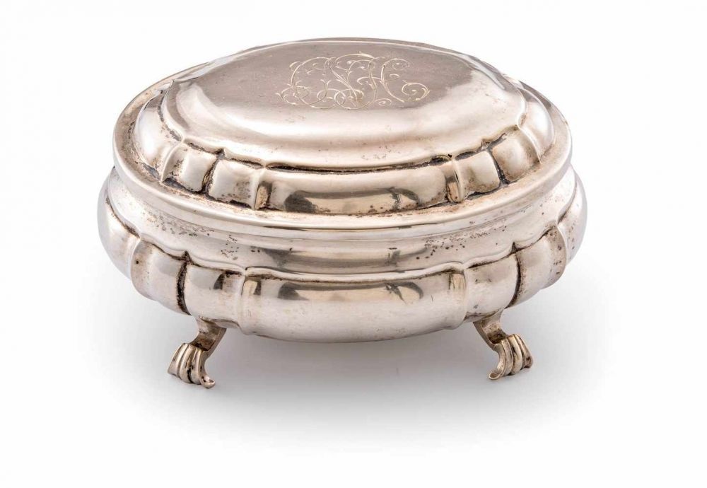 Lot 314. Zuckerdose. Breslau, 1746–58. Silber. Meistermarke FG. Ovale Form mit scharniertem Deckel auf Volutenfüssen, konvexe Wandung mit geschweiften Faltenzügen. Stadt-, Beschau-, Meistermarke, Tremolierstrich. 13x10x8 cm, ca. 239 g. Estimate 400 – 500 CHF. Schuler Auktionen AG. 12/11/19. Sold CHF 400.
