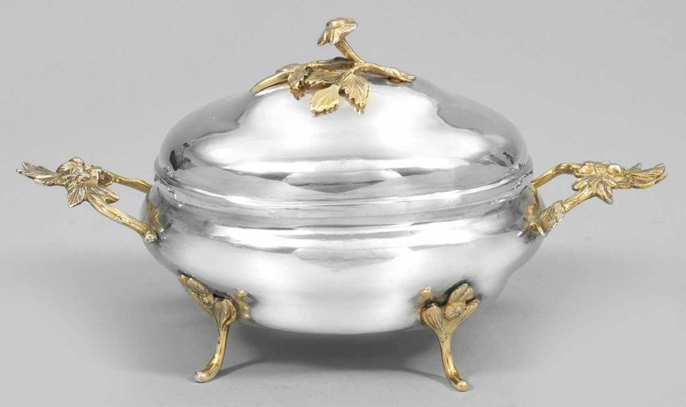 Lot 152. Kleine Breslauer Rokoko-Terrine. Silber, teilvergoldet. Von geschweiften, floral reliefierten Füßen getragener, ovaler, bauchig ansteigender Korpus mit glatter Wandung. Dekorativ gestaltete Griffe in Form von Blattranken mit zentralem Blütenstillleben. Aufgewölbter Stulpdeckel bekrönt von plastischem Blütenknauf. Innen vergoldet. Gest., Stadtmarke, Jahresbuchstabe G, Meister Martin Kiesling (wird Meister 1753). Gew. ca. 465 g. H. 12,5 cm. 25 cm x 13 cm. A small Wroclaw Rococo partly gilt silver tureen by Martin Kiesling (master since 1753). City, master´s mark and date letter G. Schlesien. Breslau. 1761-1776. Reserve 2,800 euro. Schloss Ahlden. 11/30/19. Not sold.