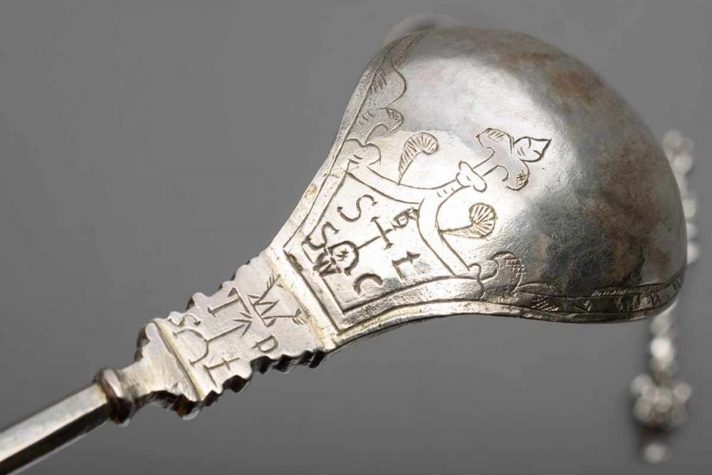 1268508. A Polish late 17th /early 18th century silver spoon, mark of Gottfried Heintze (1673-1707), Breslau. Length 19,5 cm, weight 44,8 grams. Wear. Estimate 6,000 SEK. Bukowskis. 11/10/20. Sold SEK 4,700 ($540).