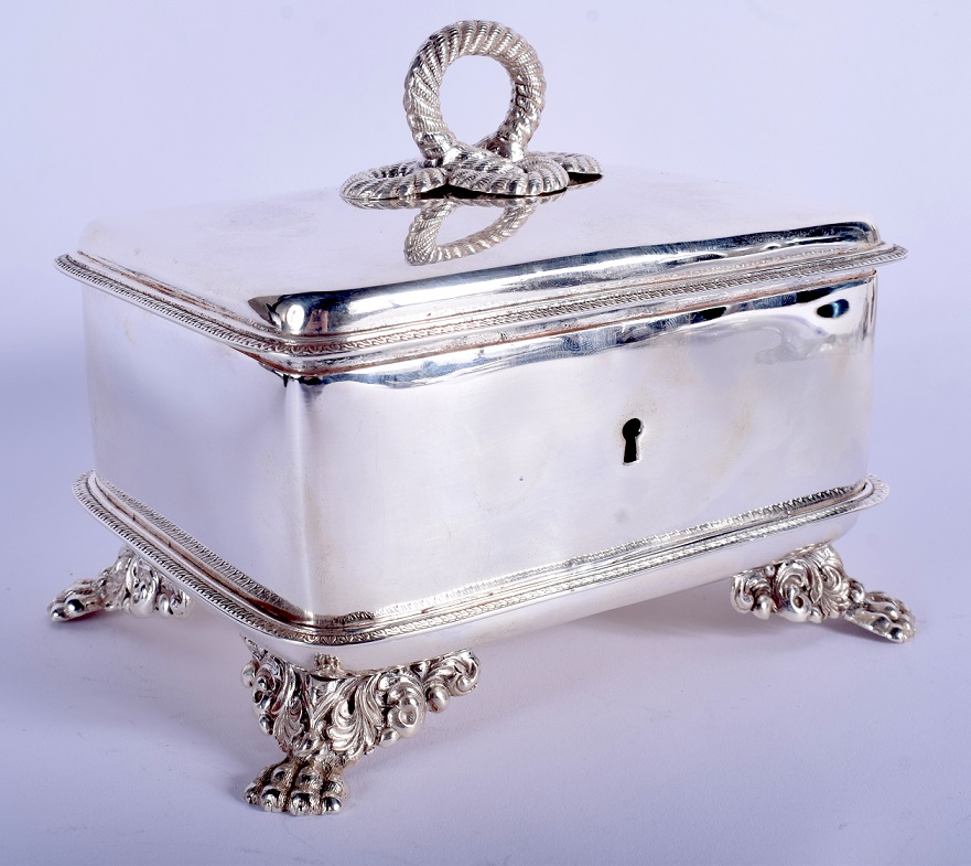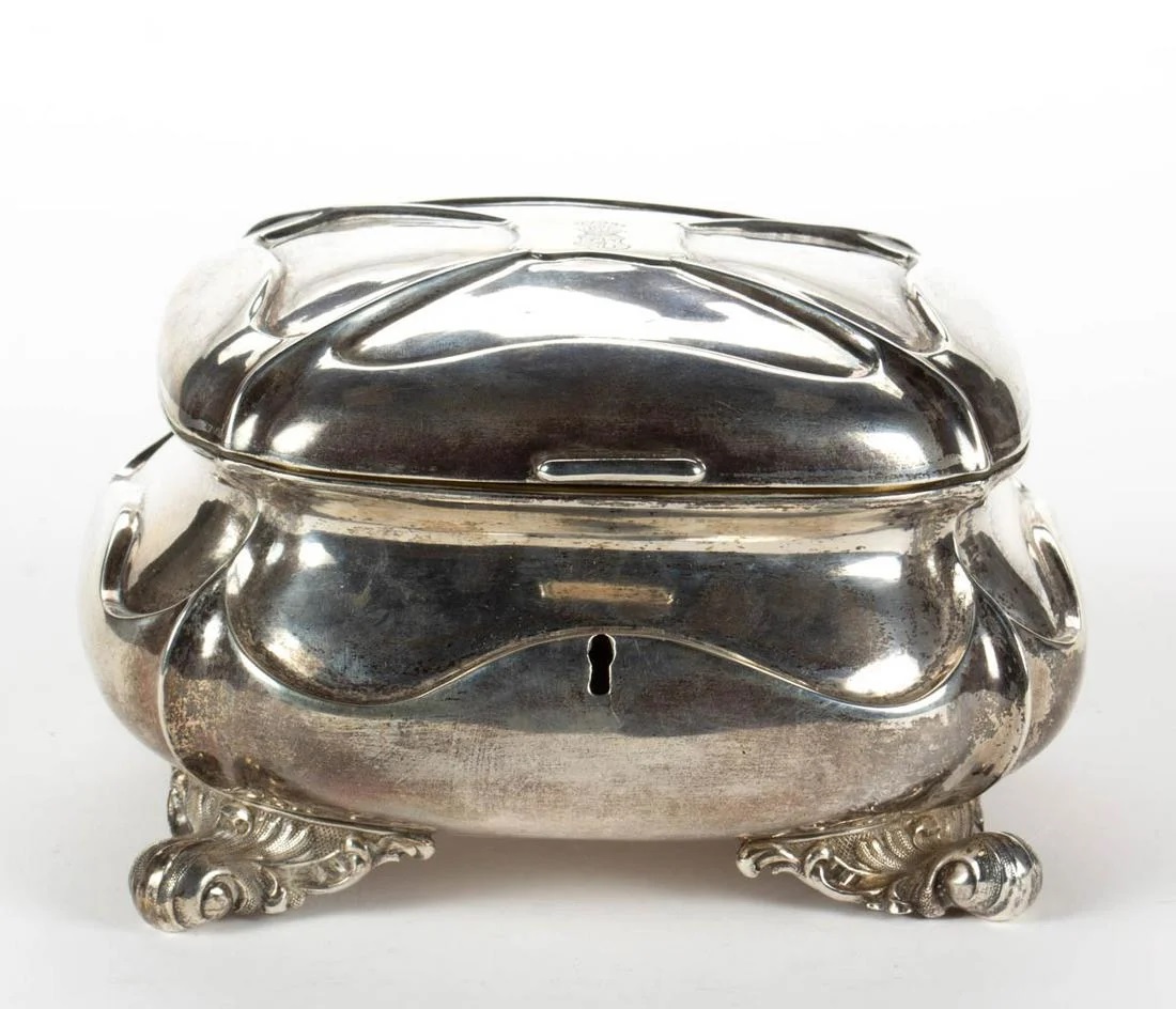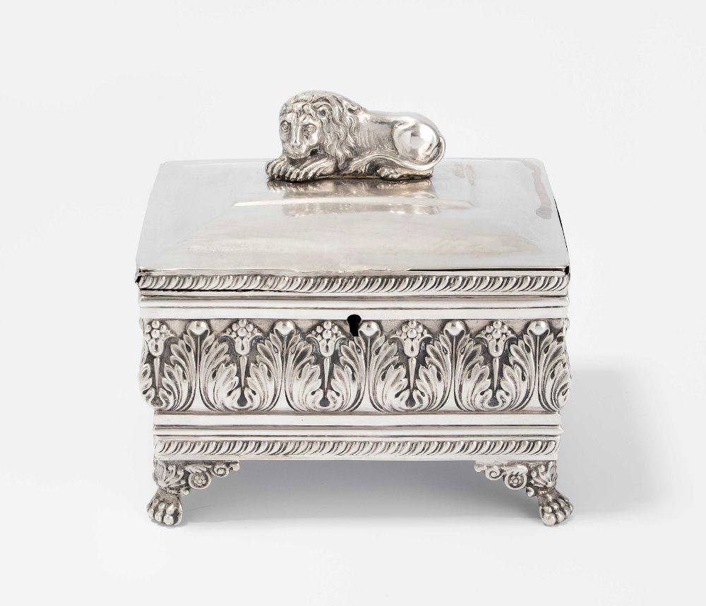 Lot 301. Zuckerdose Breslau, 1835–39. Silber. Meistermarke Schulz. Rechteckiger Korpus auf Tatzenfüssen. Deckelknauf in Form eines Löwen, Wandung mit umlaufendem Akathusblattdekor. Stadt-, Meister- und Stempelmeisterbuchstabe R. 15x10x15 cm, ca. 490 g. – Gebrauchsspuren, Deckel gedellt. Estimate CHF 500 – 700. Schuler. 12/09/20. Sold 557 euro