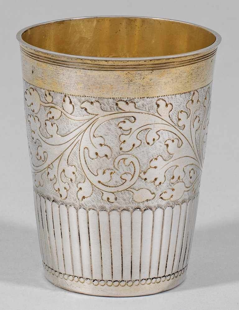 Lot 71. Becher. Breslau, um 1700, Gottfried Ihme. Silber, teilvergoldet. Konischer Becher mit glattem, leicht ausgestelltem Rand. In der unteren Wandungshälfte teilkanneliertes Zungenfries, darüber gravierte Akanthusranken im Wechsel mit getriebenen Muschelornamenten. Marken (Rosenberg Nr. 1372/1435/6616): MZ, BZ: “GI”. Tremolierstich. Französischer Einfuhrstempel. H. 9,7 cm. 94,5 g. Estimate 1,300 euro. Scheublein Art & Auktionen KG. 09/20/19