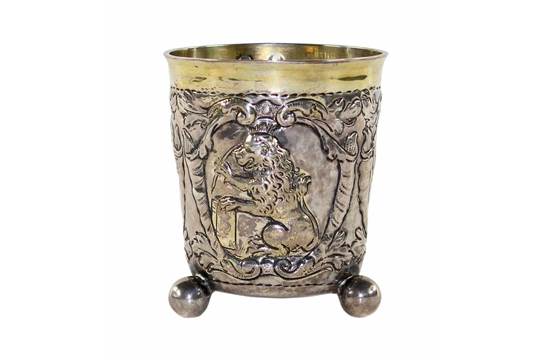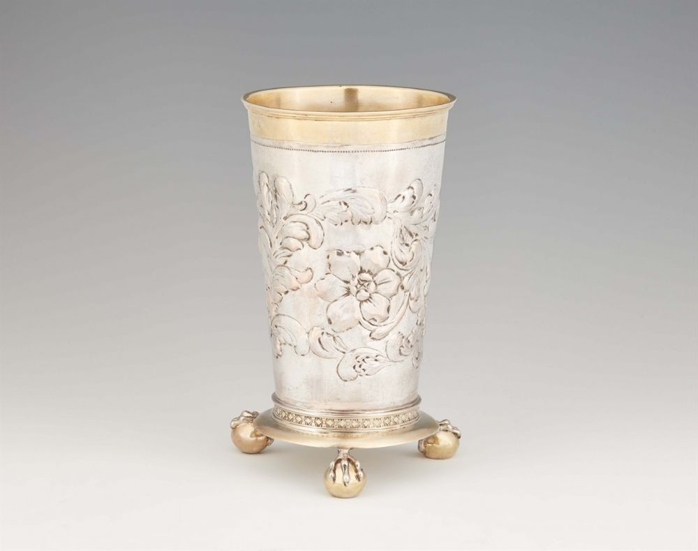 Lot 1095. A large parcel gilt Thorn silver beaker. Tall, tapering beaker on three claw feet, decorated with embossed flowerheads and acanthus. H 24.5 cm, weight 812 g. Marks of Johann Christian Bröllmann, circa 1700. Provenance: Private collection, Rhineland. Estimate 8,000 – 9,000 euro. Lempertz. 11/13/20.