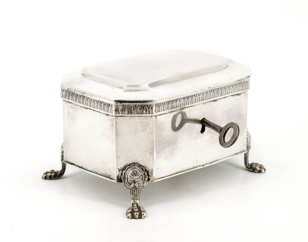 Lot 1102. Sugar box Empire. Johann Friedrich Suck, Kalisz. Oblong shape. On four winged lion’s feet. L 15.5, H 9 cm. Weight about 470 grams. Key missing. Use wear. Estimate 4.000 – 5.000 SEK € 370 – 470. Uppsala Auktions. 08/27/19. Sold SEK 7,000