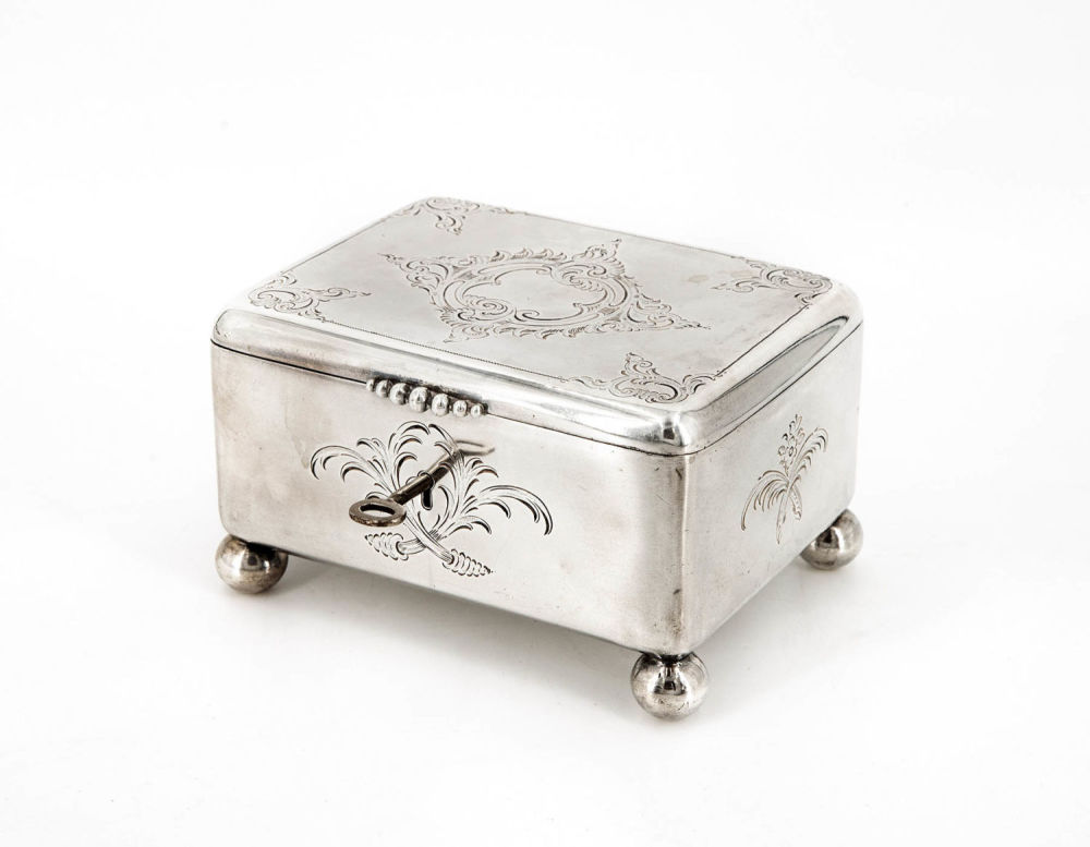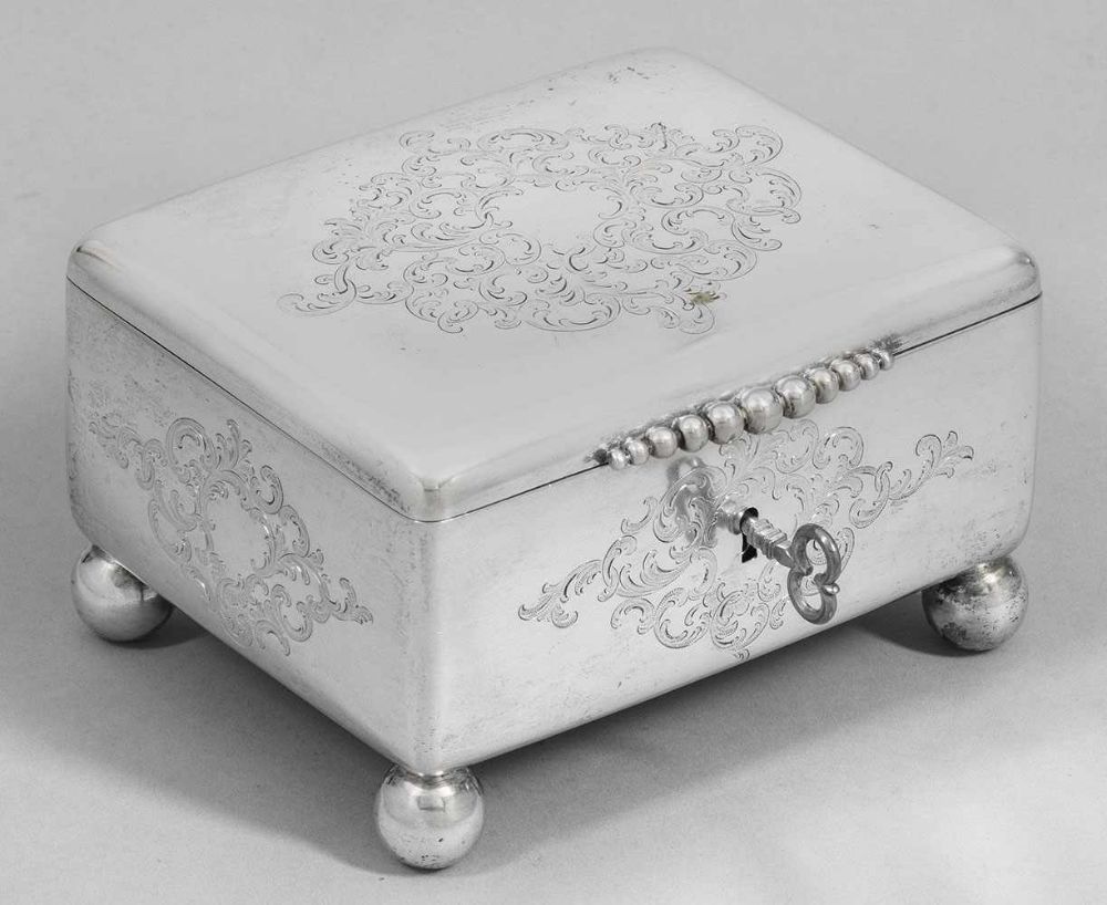 Lot 1065. Dose. 84 zolotnik Silber, 512 g. Rechteckig mit abgerundeten Ecken, auf Kugelfüßen. Front und Deckel mit graviertem Rankendekor, Rotwild in Kartusche und aufgelegtem Monog. Mz. Nast, Beschau für Warschau, Beschaumeister I.B. und dat. 1862. 7,5x 13x 10 cm. Reserve 100 euro. Dannenberg. 12/6/19.