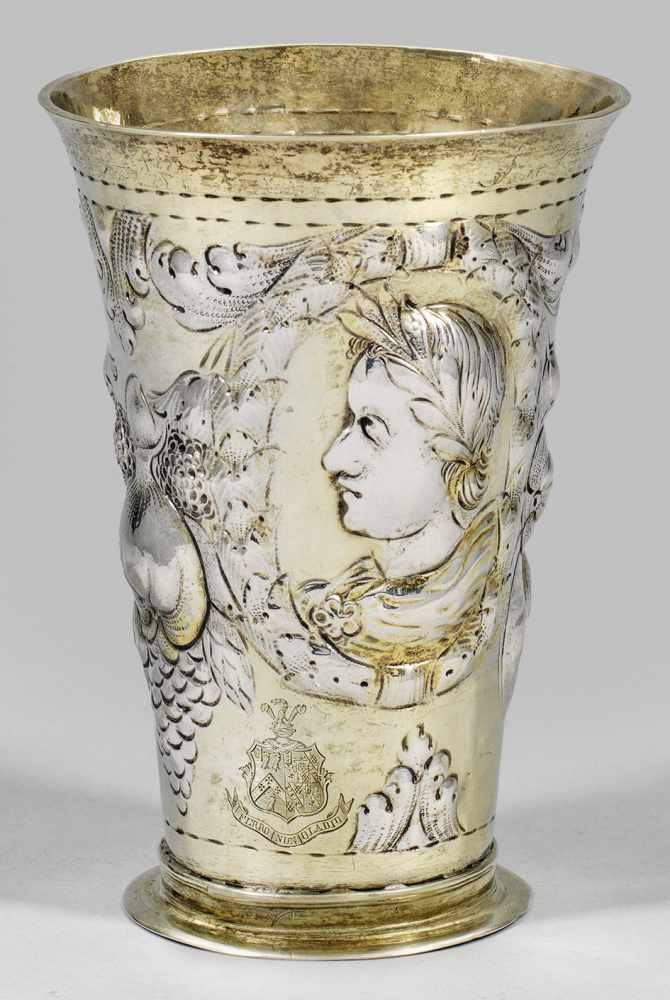 Lot 885. Kelchbecher, Barock, Danzig um 1680. Silber vergoldet. Beschau Danzig, Meistermarke f. Peter Rohde II. u. Beschau St. Petersburg m. “1789”, kyrill. Beschaumeister, Tremolierstrich. Hoher, kon. Korpus m. leicht ausschwingender Lippe auf flachem rd. Stand. Wandung umlaufend m. Blattranken- u. Früchterelief, dazw. 2 gr. Lorbeer-gerahmte Profilportraits im Stil röm. Imperatoren. Untere Kante m. 1 kl. Wappengravur (nachträgl.) m. Spruchband “Ferro Non Gladio”. Oberfläche leicht ber., teils minim. verzogen, Standkante 1 x minim. gestaucht. H 16,2 cm. Reserve 4,000 euro. Dobritz. 10/24/20. Not sold