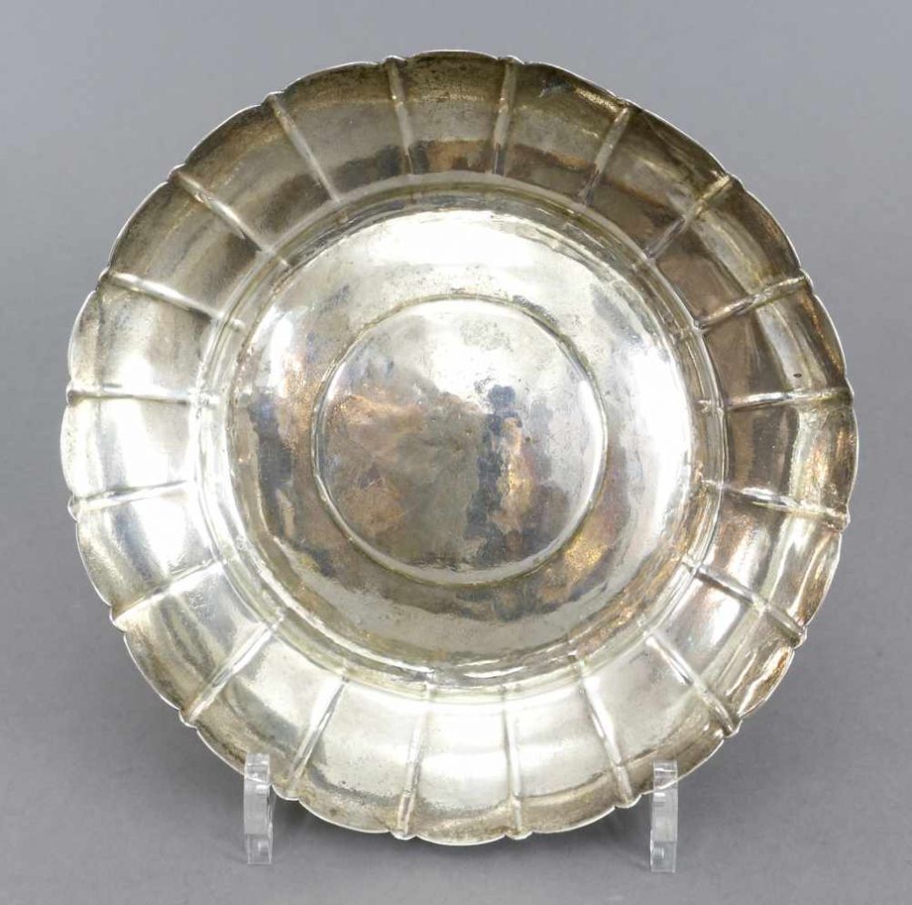 Lot 354. Art-Déco-Schale, 800er Silber. Auf Füßen doppelkonkav ausgeschwungene Schale mit geschweift-gezacktem Rand. Gebrauchsspuren. Gest. Gew. 151 g. H. 6,5/ D. 17-20 cm. Krakau. 1930er Jahre. Opening 80 euro. Kunstauktionshaus Leipzig. 08/24/19