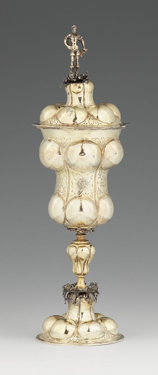 A very rare parcel gilt and embossed covered Gdansk goblet with very fine engraved biblical scenes of Delila and Samson by Peter Rohde III (master since 1688). City and master´s mark. Danzig. Um 1700. Reserve 32,000 euro. Schloss Ahlden. 09/07/19. Not sold