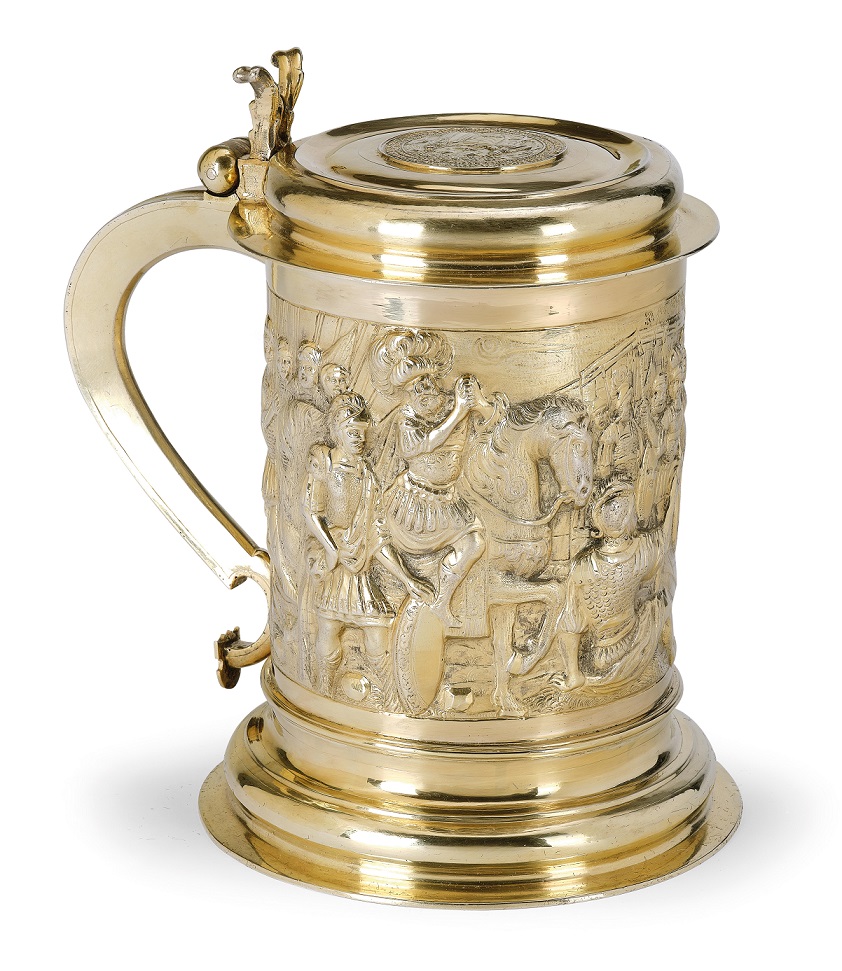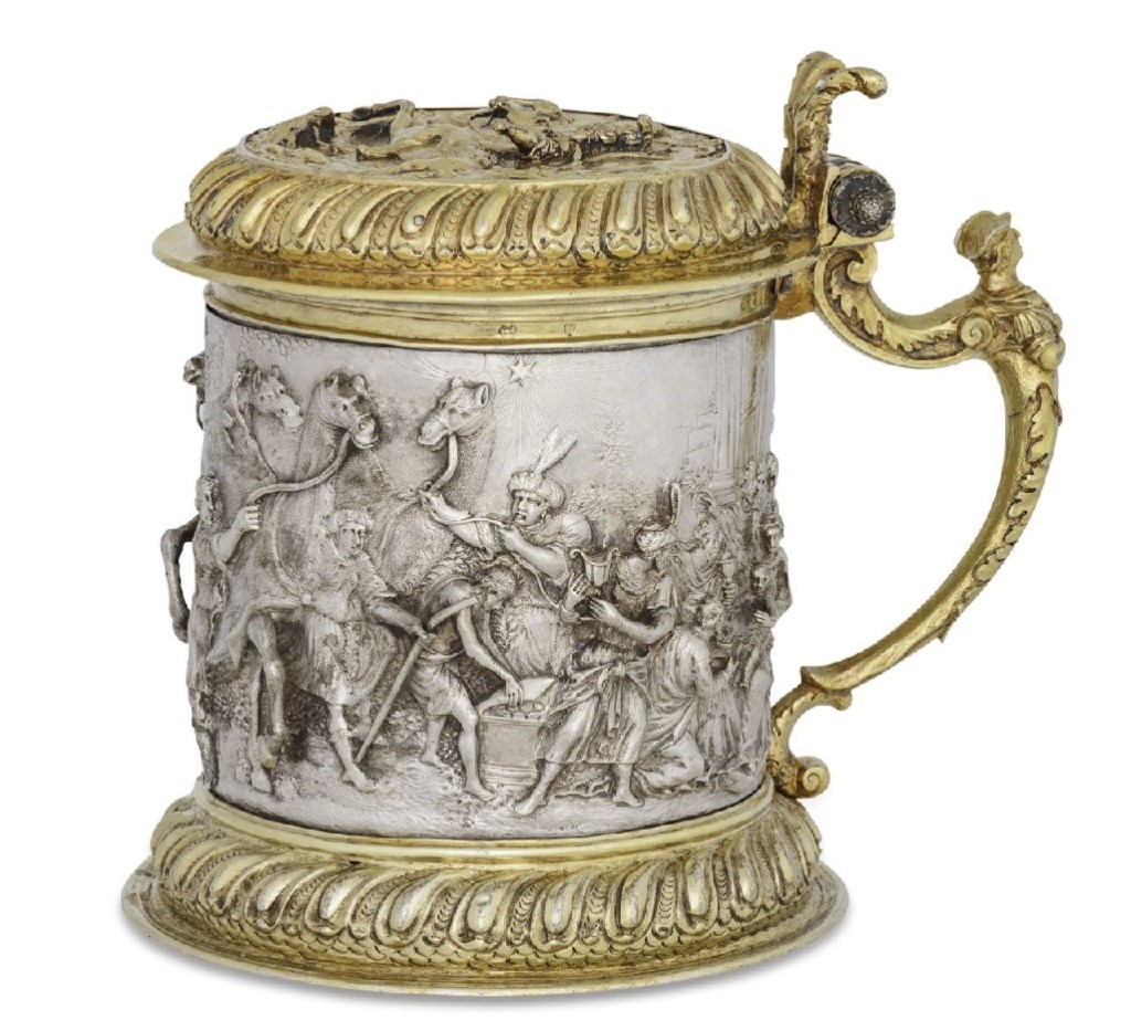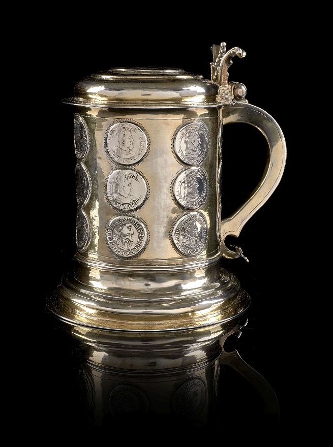 Lot 3. A LARGE GERMAN PARCEL-GILT SILVER GILT TANKARD, PETER RHODE II, DANZIG, CIRCA 1680. The hinged cover inset with a coin celebrating a Royal Polish marriage, dated 1676, within a band of chased foliage, the body chased in relief with Orpheus charming wild birds and animals with his lute, on a circular foot with chased foliate border, the base inset with another Royal Polish coin. 23cm high, 1265gr., 40oz. 12dwt. The coin in the cover of this tankard celebrates the marriage of the Polish King John III Sobieski to Marie Casimire Louise de La Grange d’Arquien in 1674. The coin in the base celebrates his predecessor Sigismund III Vasa (1587-1632). Estimate 8,000 – 12,000 GBP. Sotheby’s. 11/11/19. Sold 13,750 GBP