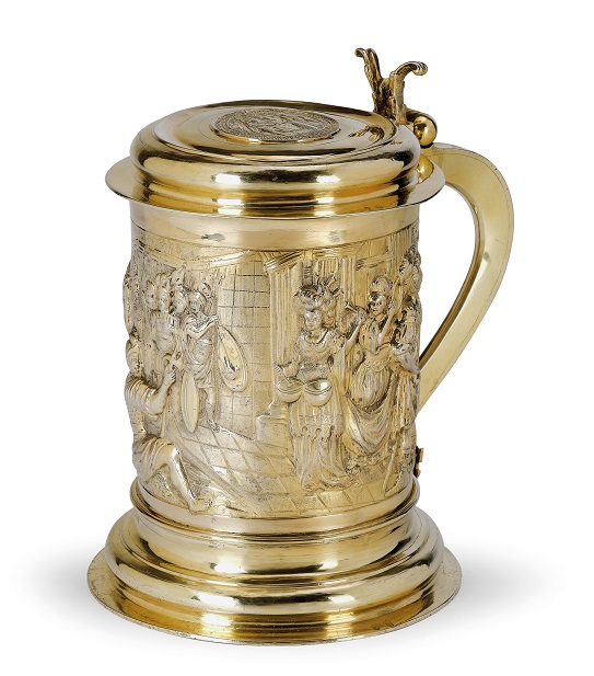 Lot 1049. LIDDED TANKARD. Gdansk, last third of the 17th century. Maker’s mark (Michel) Jaske. Chased, cast and chiseled. Parcel-gilt. H 20 cm. 1230 g. Provenance: Swiss private collection. Estimate CHF 6 000 / 8 000 (€ 5 260 / 7 020). Koller. 09/27/19