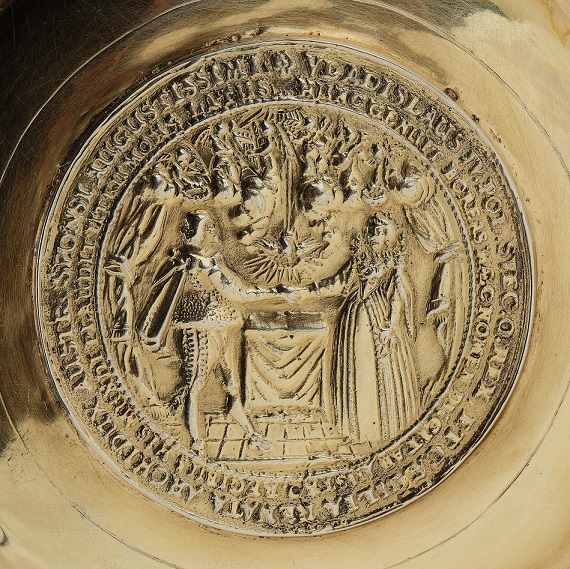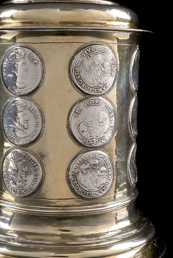 Jest to co prawda niemiecki pozłacany kubek, w dodatku wykonany w Berlinie a nie na terenach polskich, lecz odnotowuję go ze względu na wlutownie w jego powierzchnię aż 18-tu srebrnych polskich monet z okresu Wazów. Stąd, traktuję to jako ciekawy polonik. Swoją drogą, polskie srebrne monety z tego okresu cieszyły się sporym wzięciem u wielu europejskich złotników. Tego rodzaju kubki, puchary spotyka się stosunkowo często. Wycena jest bardzo wysoka, choć z drugiej strony rękodzieło stare i poszukiwane przez niemieckich kolekcjonerów with Polish flavour.