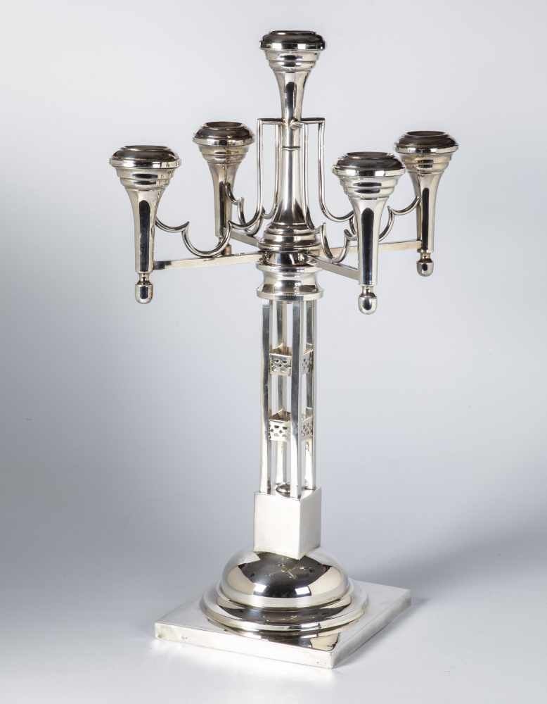Lot 68. Girandole. Silver. 5-leaf; Vaulted stand above flat, square plinth. High, four-sided shaft, merging into cylindrical, slender candlestick arm with rounded spout. Four straight chandelier arms connected to the floral engraved body by curved bars. Cornucopia-like nozzles. Gest., foam brand, master brand JS. Unw. rest., minim. best.; Weight approx. 1700 g. H. 63 cm. /V/A Warsaw five-light silver girandole. Minor restored and flawed. Assay and master’s mark JS.// /T/Poland. Warsaw. Around 1920. Estimate 680 euro. Shloss Ahlden. 11/30/19