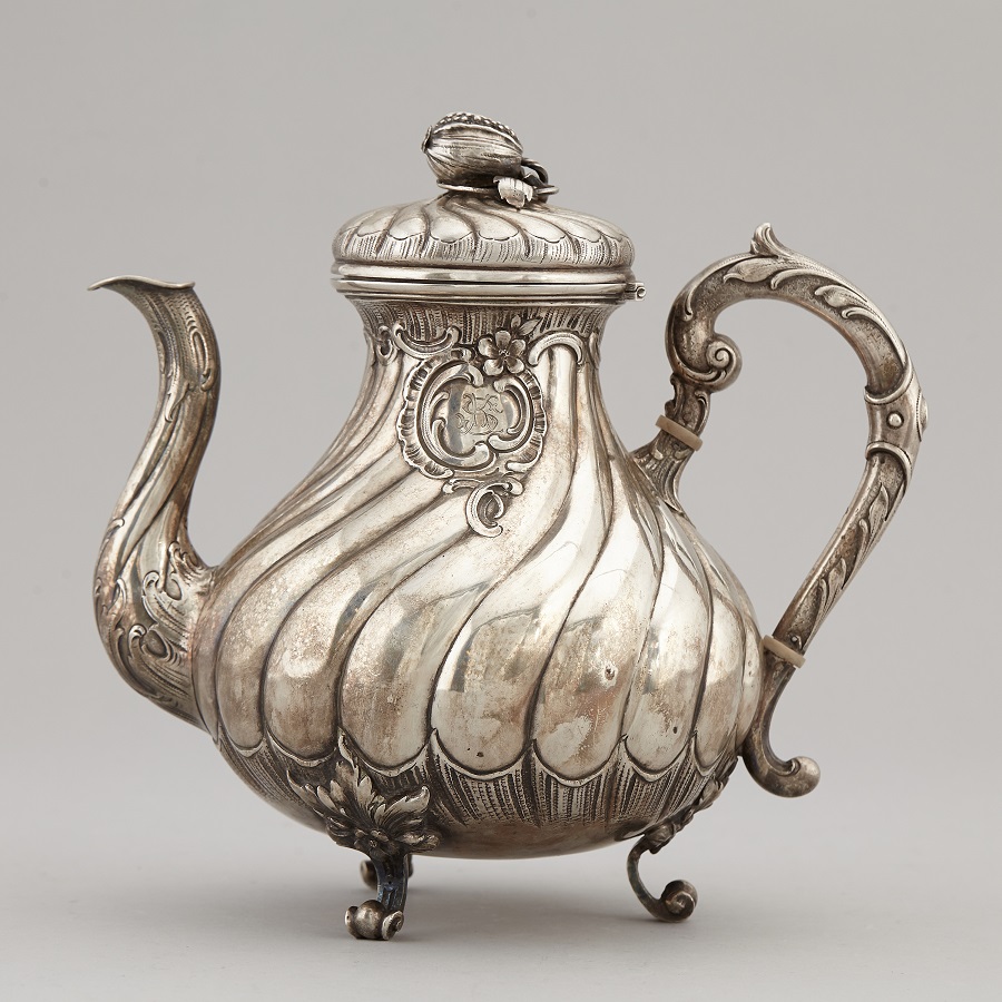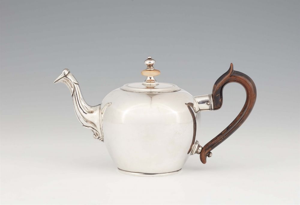 Lot 1101. A rare Gdansk silver teapot. Solid rounded corpus with curved spout, wooden handle and remnants of gilding to the interior. H 12 cm, weight 454 g. Marks of Jakob Haase, c. 1750 – 60. Estimate 6,000 – 7,000 euro. Lempertz. 11/13/20