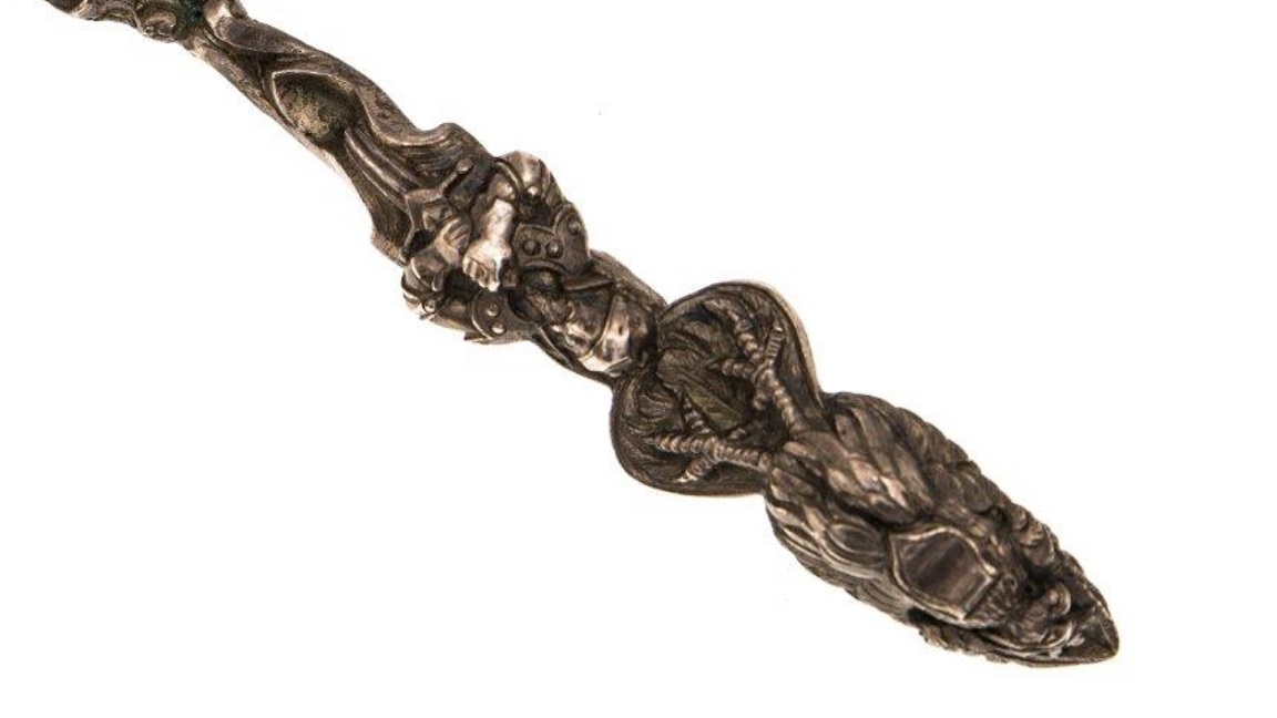 A large, five branch candelabrum made of 800/1000 silver. Poland – First half 20th century. .800 silver. 820 g weight. Silver marked woman’s head with the number 3 and the letter k, silversmith mark RB in oval. Overall height 51 cm, range arms 31 cm. Estimate $670 – $890. Catawiki. 11/29/19