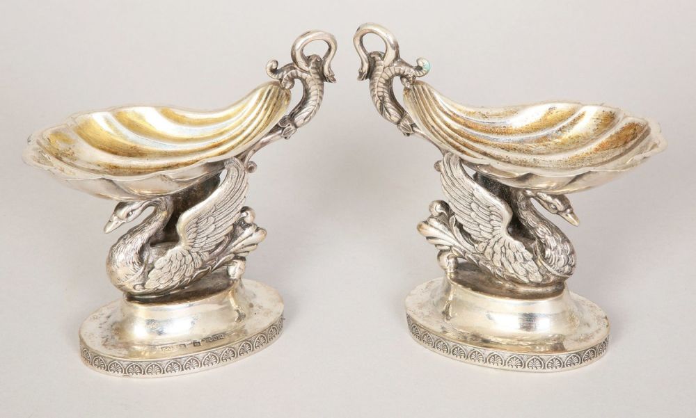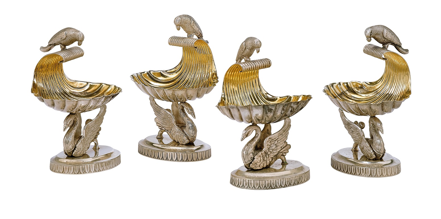 Lot 136. 4 Cruet Frames from Warsaw, silver, inner gilding, oval, sculptural swan supporting the shellwork bowl, parrot finial, height 12.5 cm, weight 752 g, master’s mark “Malcz”, hallmark for 12 lot silver. Estimate 700 – 1,000 euro. Dorotheum. 12/09/20. Sold 3,072 euro