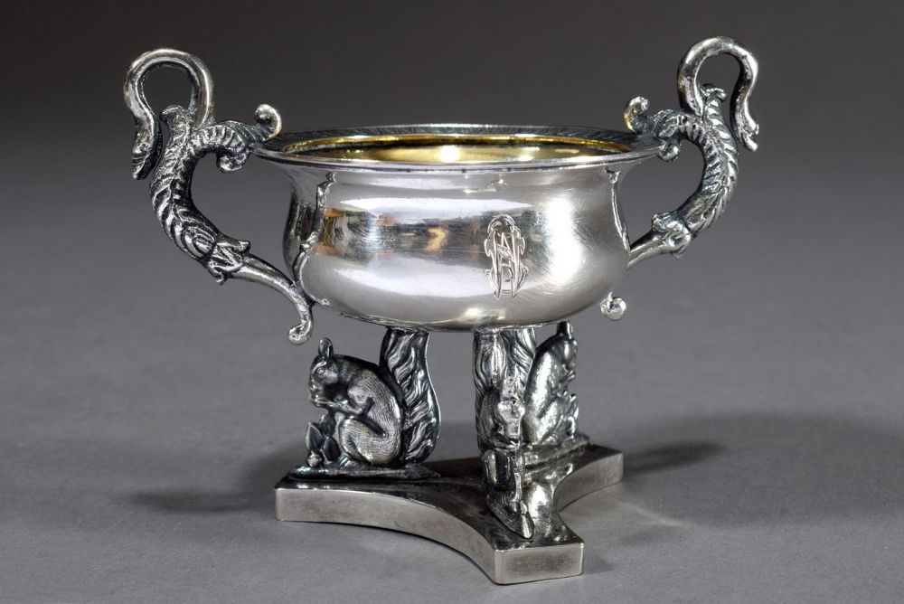 Lot 169. Srebrna solniczka. I połowa XIX w. Czarka wsparta na owalnej stopie z trzonem w formie dwóch delfinów. Uchwyty zakończone rozetkami. Na podstawie wygrawerowany jest monogramm « ML ». Puncowanie : « Szwarce » (Feliks Jan Szwarce, 1807-1838) i « w / Warszawie » ; bez próby (niemal 13 łutów). Wysokość: 8,5 cm, wymiary podstawy : 12 x 6,3 cm, waga 167 g. Millon. 12/07/20. Sold 400 euro.