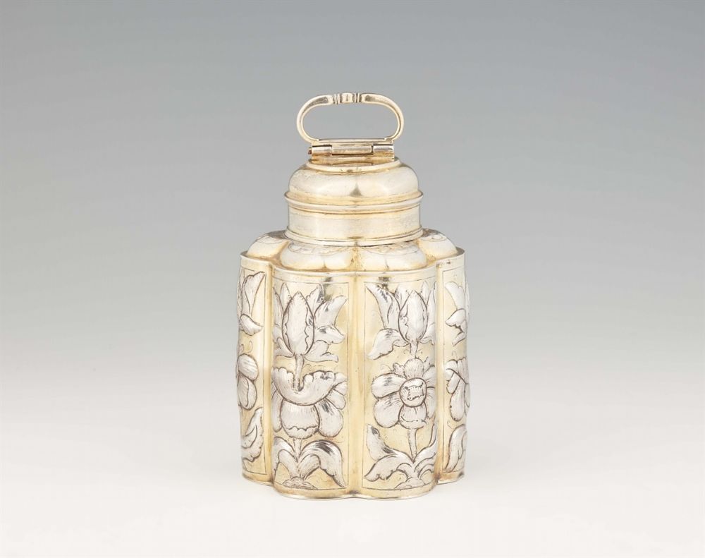 Lot 1096. A Gdansk parcel gilt silver canister. Moulded vessel embossed with flowerheads. Screw-top lid with a folding handle concealing an inner lid. H 17 cm, weight 435 g. Unidentified maker’s mark “HI” or “IH, possibly that of Johann Heinrich Hutmacher (1695 – 98), last quarter 17th C. Estimate 10,000 – 12,000 euro. Lempertz. 11/13/20