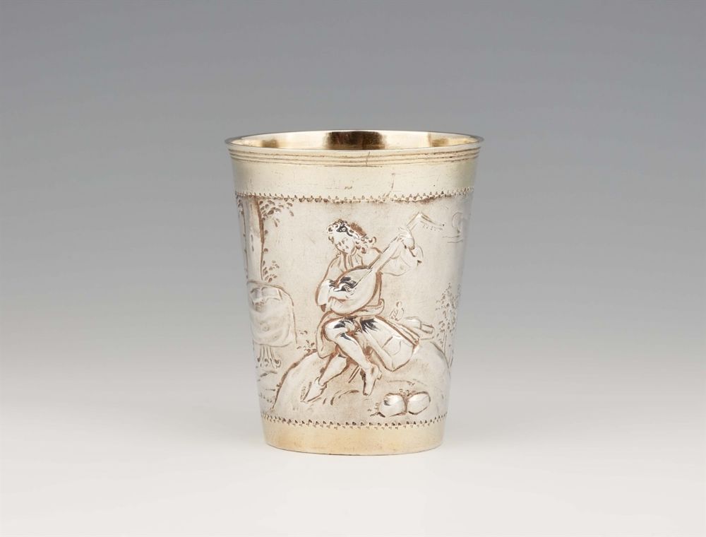 Lot 1097. A Gdansk parcel gilt silver beaker. Tapering beaker with embossed depiction of a courtship scene in a park landscape. H 9.4 cm, weight 97 g. Marks of Constantin Hein, c. 1720. Estimate 2,600 – 2,800. Lempertz. 11/13/20