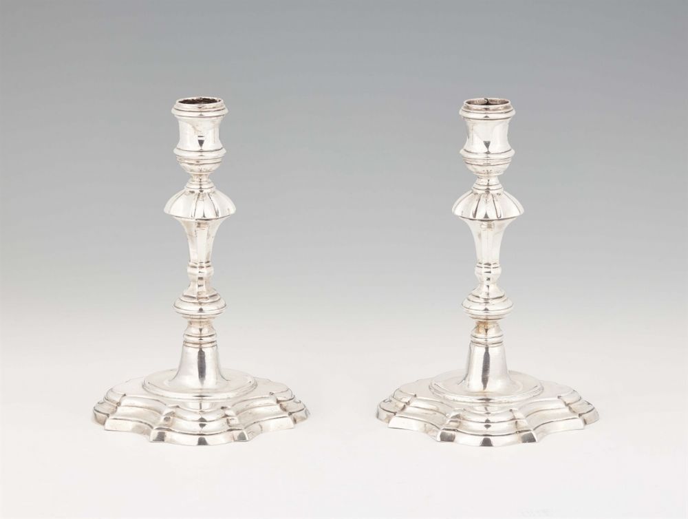 Lot 236. PAIR OF SILVER CANDLESTICKS WITH ROCAILLE DECOR. Breslau.Around 1761-1776. Maker/Designer:Michael Alex.Silver. Highly vaulted round foot with a laminated rim. Slender baluster shaft. Embossed and engraved decor with rocaille curves, shell- and flower decor. 548g. Height 20,5cm / 21cm. Mark:Inspection mark Wroclaw (Hintze, Wroclaw no.20), year letter G around 1761-76, maker’s mark Michael Alex (1752-1782, ibid. no.161), testing mark, prussian tax stamp. Once with owner’s monogram “GHvP”. Estimate 1,800 – 2,800 euro. Van Ham. 11/18/20