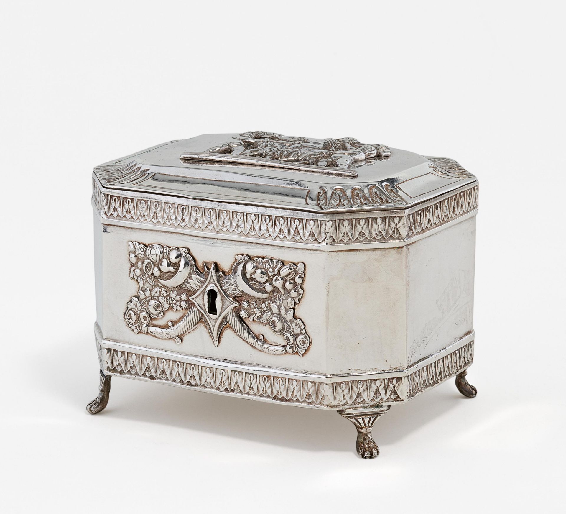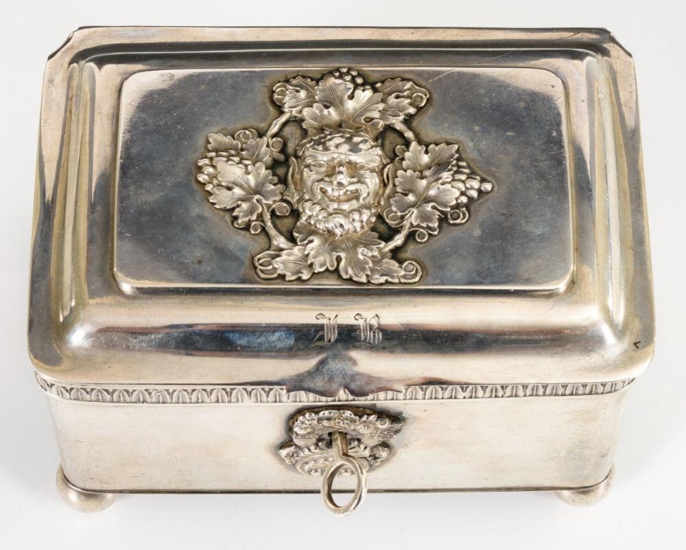 Lot 135. A Sugar Bowl from Warsaw, silver, of rectangular form, slanted corners, the body with applied classical figures and birds, hinged lid with sculptural lion finial, lock, monogrammed, 17 x 12 x 13.5 cm, weight 834 g, master’s mark T. Klimaszewski, Warsaw hallmark for 12 lot silver. Estimate 500 – 1,000 euro. Dorotheum. 12/09/20. Sold 2,560 euro